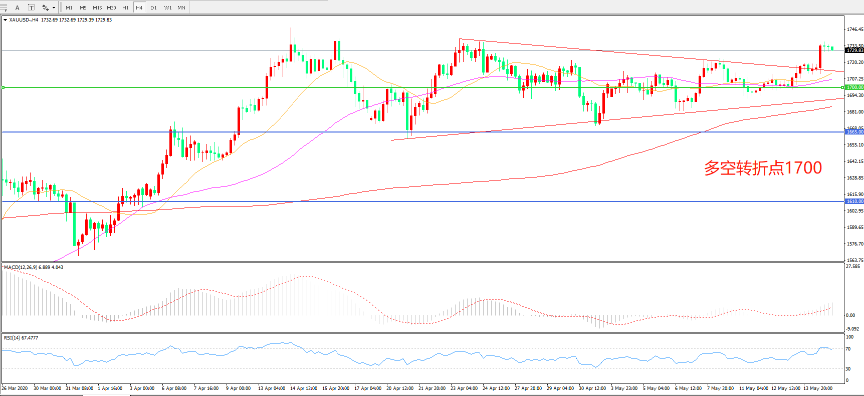周四(5月14日)特朗普表示,他对中国未能遏制冠状病毒疫情感到非常失望,称全球疫情给他与中国的贸易协议蒙上了一层阴影,中美贸易关系紧张的担忧推升了市场上的避险情绪,现货黄金跳升至1730美元上方,收报1733.46美元/盎司。