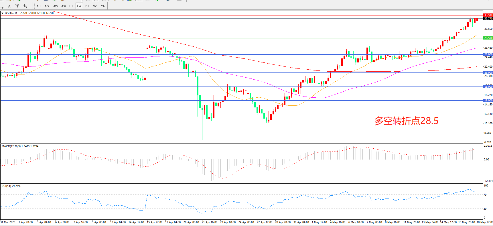 周一(5月18日),受需求改善和疫苗研发利好刺激,美国WTI原油大幅拉升,收报32.65美元/桶,创下两月以来最高收盘价。随着OPEC和其他主要产油国同意减产970万桶/日,市场风险情绪大幅改善,尤其疫苗研发领域也传来重大利好时,多头信心受到鼓舞。