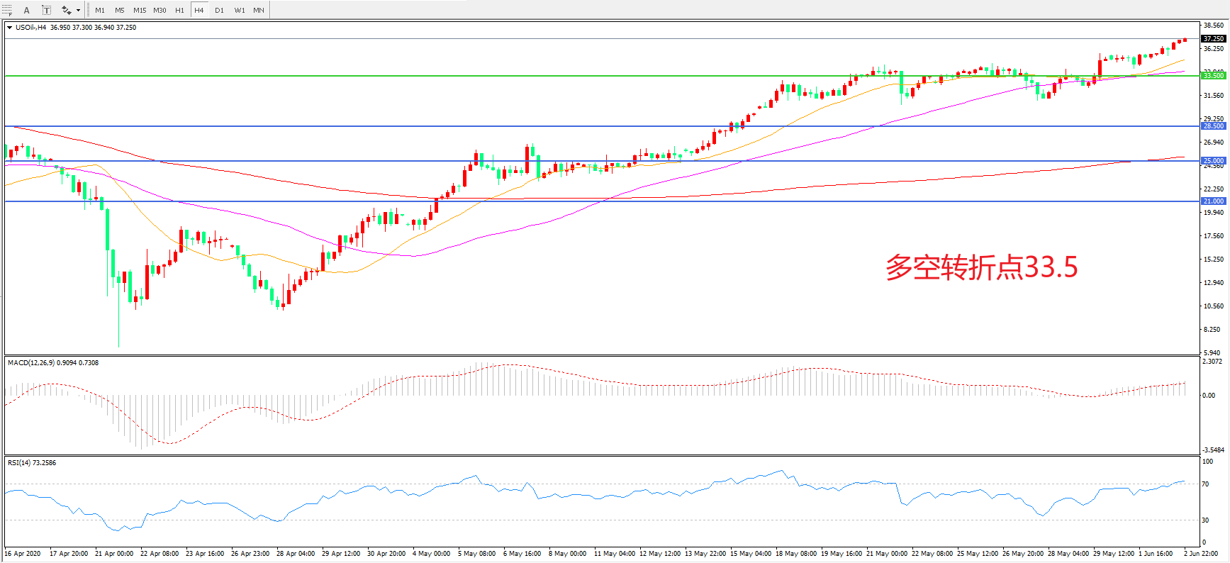 周二(6月2日),OPEC延长减产的预期让多头有了持续推涨的理由,也让油价不断刷新反弹以来高点,美国WTI原油高开高走,收报37.06美元/桶,日内涨逾3.5%。从走势图来看,美国WTI原油已经完全收复了价格战以来的全部跌幅,接下来将面临的是3月9日的巨大缺口。