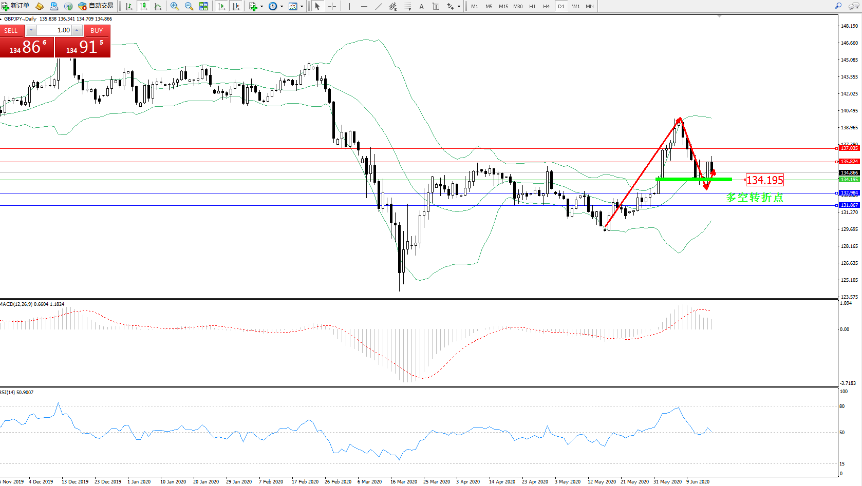 交易策略:134.195上方看涨,目标135.824、137.035