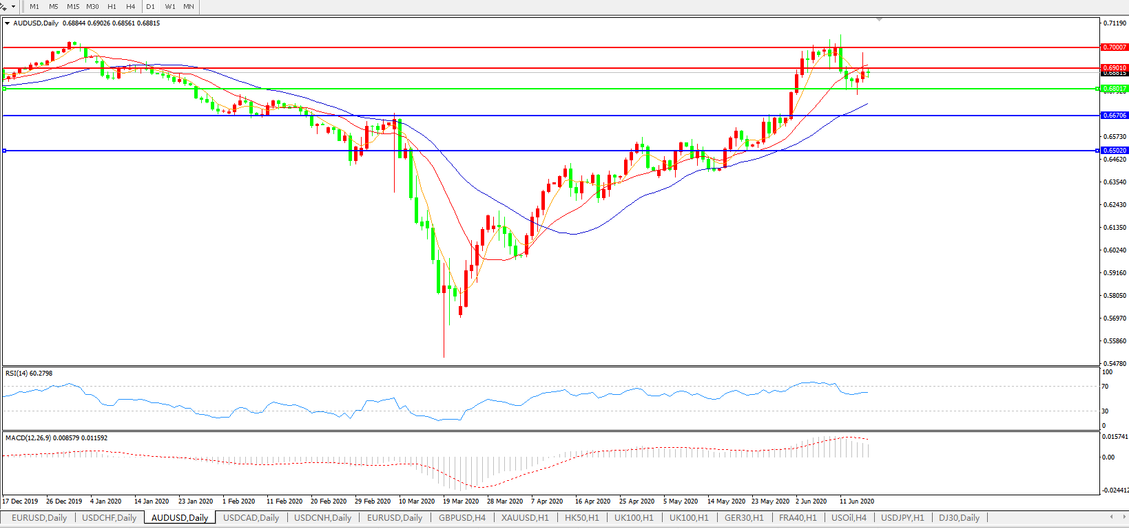 澳洲当地局势开始为澳元带来提振,其中包括经济重启和较低的确诊比例,铁矿石价格走高,以及对失业率已经触顶的预期等。不过虽然美国疫情存在二次爆发的风险,但还没有得到充分的证明,因此这将有助于澳元表现;昨日澳元在跌至0.68附近后展开反弹,收盘重新回到0.69上方。随后如果经过反复修正都能持稳于上升趋势线0.68之上,则后市澳元兑美元仍有望向高峰攀升;因此还是可以考虑趁低吸纳澳元的操作为主,以保持与大趋势走向一致,因为至今澳元的上升通道尚未遭到破坏。