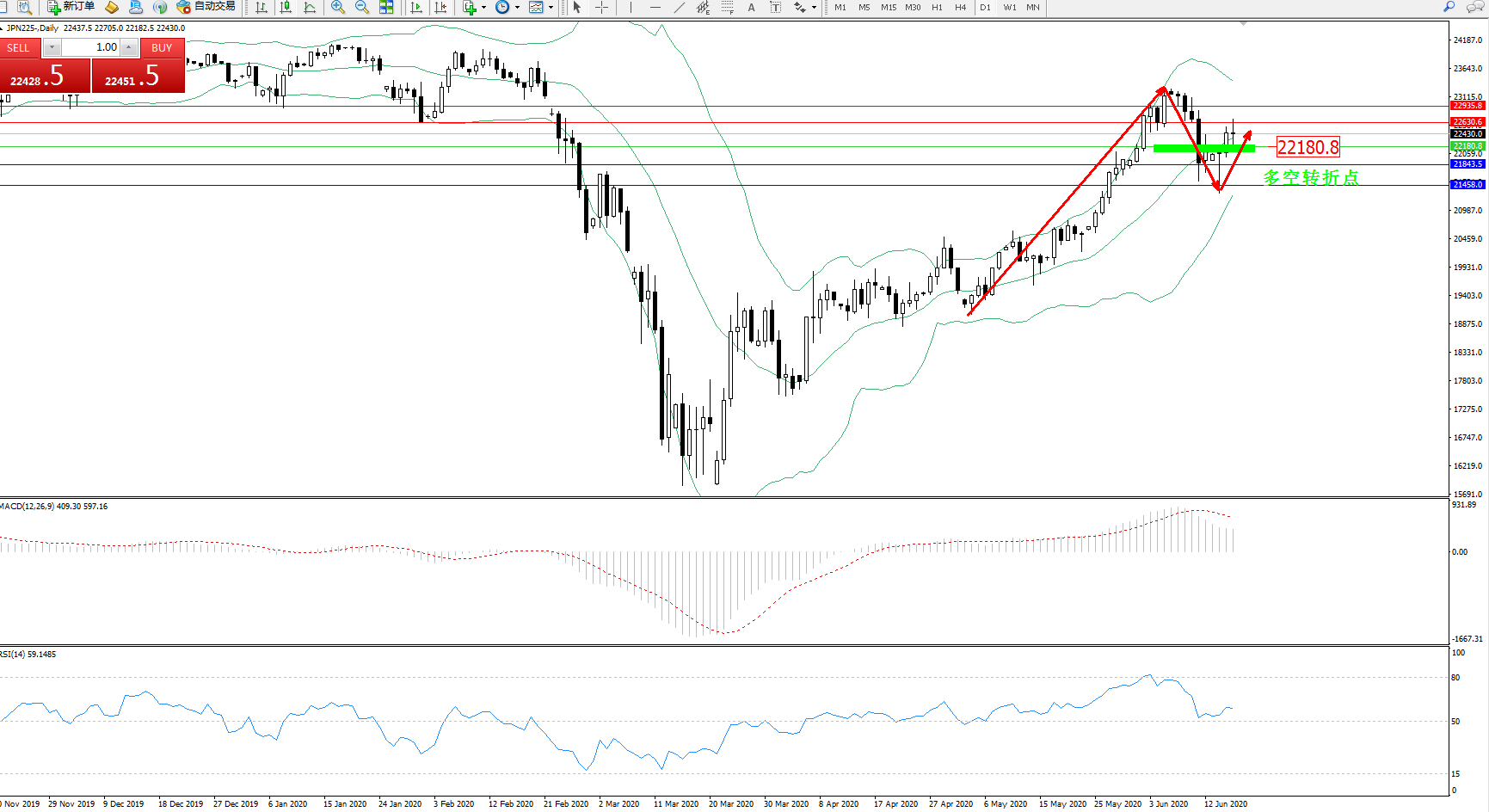 日经225指数617日(周三)收盘下跌129.71点,跌幅0.57%,报22452.50点。日内亚洲地区地缘紧张局势发酵,尽管美股隔夜大涨,亚洲股市纷纷承压,此外投资者对二次疫情的爆发也充满担忧情绪,日本5月出口降幅扩大,在新冠疫情导致贸易下滑之际,对美国的出口下降一半。整体出口同比下滑28.3%,为2009年以来最大降幅,汽车及零部件出口锐减。经济学家预期为下滑26.1%。日本5月与美国的贸易顺差降至纪录低位,对美出口创2009年全球金融危机以来最大降幅。整体而言,汽车出口下滑约三分之二;全球GDP前景或比预期更糟,即使隔夜美元在美国数据利好及美联储主席鲍威尔偏鹰言论下大涨,市场仍对本周后半段全球风险情绪面临的下一步不确定性感到不安。