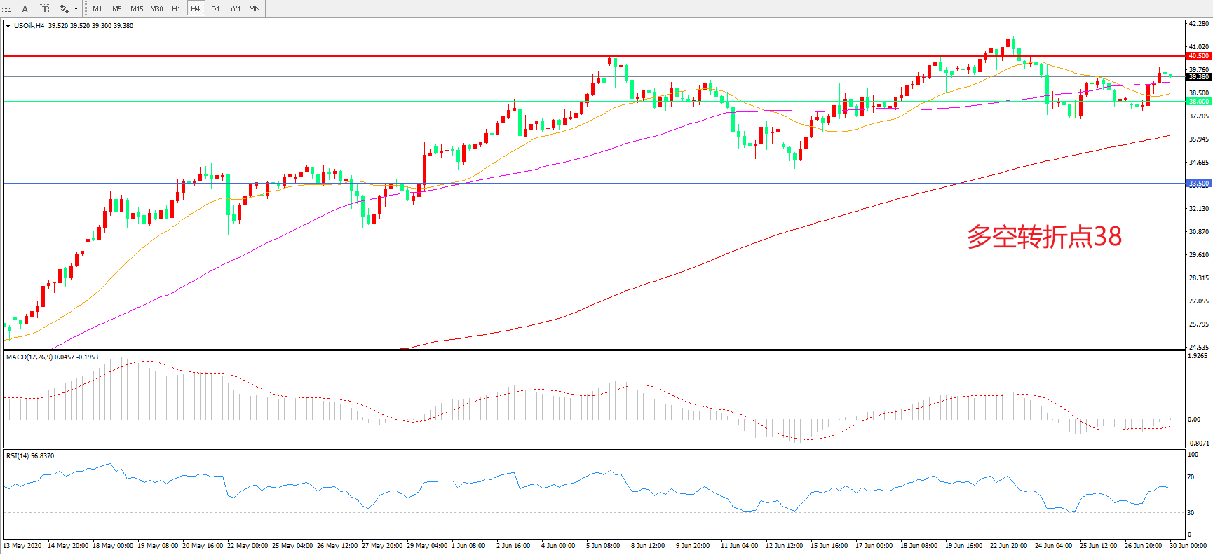 4小时图看,油价触碰38美元一线连续拉升,显示下方支撑较强,均线系统走平,MACD红柱增加,RSI指标走平,日内延续震荡概率较大。