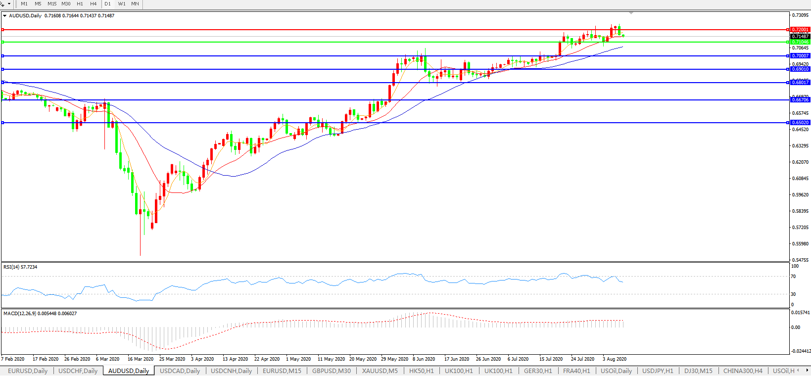 澳元兑美元在周五纽约时段盘初承压下跌,触及10日均线支撑位0.7172,因美国非农就业数据向好的状况被市场充分咀嚼后,美元指数走强,同时,投资者对于周末期间全球疫情和地缘局势走向的焦虑,也推动了商品系货币遭到进一步抛售,更多资金仍然流入避险美元市场。 一旦澳元汇价日内无法守住10日均线,将意味着短线头部的成型,汇价下周可能近一步下探0.71关口,特别,考虑到全球地缘和贸易风险的发酵,以及澳洲本国疫情的持续,下周澳元汇价开盘仍有跳空下行压力。