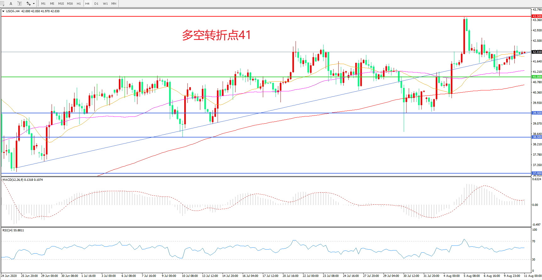 4小时图看,油价回踩55周期均线后震荡上行,短期走势回暖,43.5成为上方主要目标,MACD红柱增加,RSI指标走平,日内延续上行概率较大。