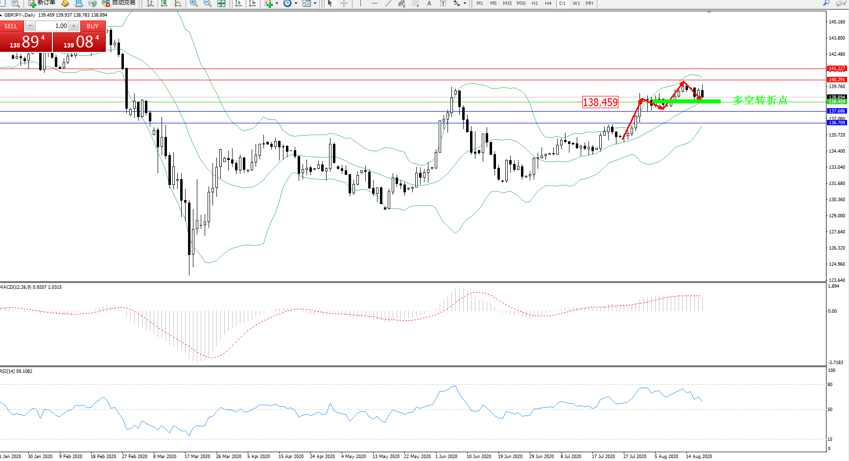 英镑兑日圆处于138.894附近震荡,英国7月消费者物价指数(CPI)和英国7月零售物价数据均好于预期,该数据减轻了英国央行进一步降息的压力,为英国央行提供了更多时间来继续目前的观望态度,随着经济结束封锁后重启,越来越多的英国企业报告营收增加,但很多企业的现金仍紧张。英国商会(BCC)称,38%的企业在最新的周度调查中报告营收增加,高于之前的34%。另外38%的企业报告营收下降。英国与欧盟开始第七轮脱欧谈判,将持续至8月21日, 不过英国和欧盟官员将在接下来的七周内实现自3月份以来就未能企及的目标:就双方未来关系达成协议。据英国《金融时报》,欧盟拒绝英国关于让英国卡车司机继续大量进入欧盟的开放要求,为英国脱欧贸易恢复谈判出现冲突奠定基础。