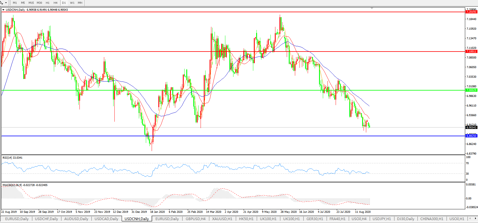 交易策略:在7.1000之下,看跌,目标价位为7.0000,然后为6.8820。