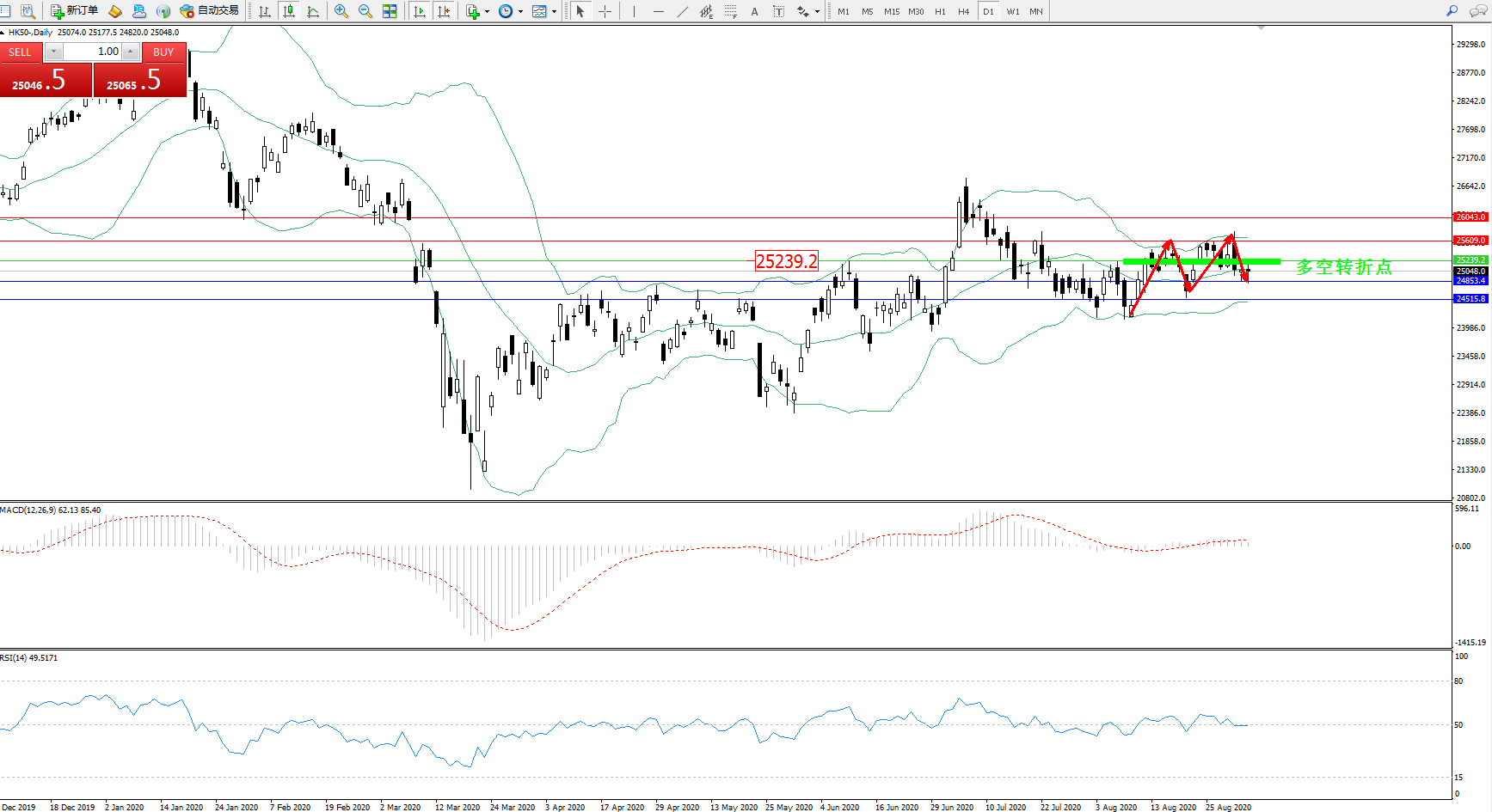 香港恒生指数9月2日(周三)收盘下跌64.76点,跌幅0.26%,报25120.09点;港股三大指数探底回升,恒指早盘一度跌超1%,午后回升转涨。阿里与苹果概念股领涨,比亚迪电子飙涨14%,阿里影业大涨7%;大型科技股延续强势,京东涨超7%再创新高,阿里、美团均升3%继续破顶,腾讯亦收涨超1%。圆通速递国际暴涨259%,母公司获阿里豪掷66亿战略增持12%。今日南下资金净流入52.34亿港元,大市成交额为1595亿港元。 当前港股呈现震荡走势,中期重要支撑在23000点。中期展望的观点:“螺旋式轮动配置”理念,遵循“成长-周期-消费”的板块轮动。配置方向上,短期市场关注点在盈利确定性较强的必需消费、物业管理、黄金股。中期重点关注消费股和周期股。恒指由7月初至今,大部份时间于24,200-26,000之间窄幅波动,市场预计于9月份中下旬有向上突破的机会较高,利好因素包括美国联储局修改通胀目标、美元疲弱、人民币走强。