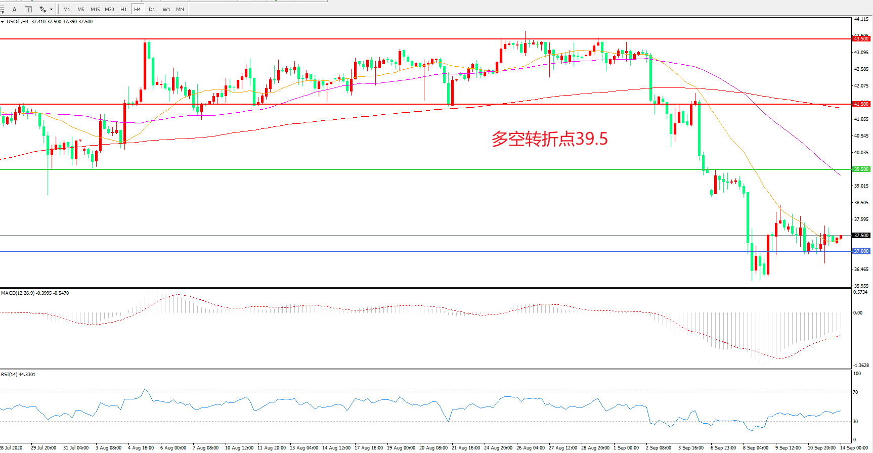 4小时图看,油价延续震荡下行,整体走势偏弱,21周期均线成为短期阻力,37美元成为短期支撑,MACD绿柱缩短,RSI指标走平,日内延续震荡概率较大。