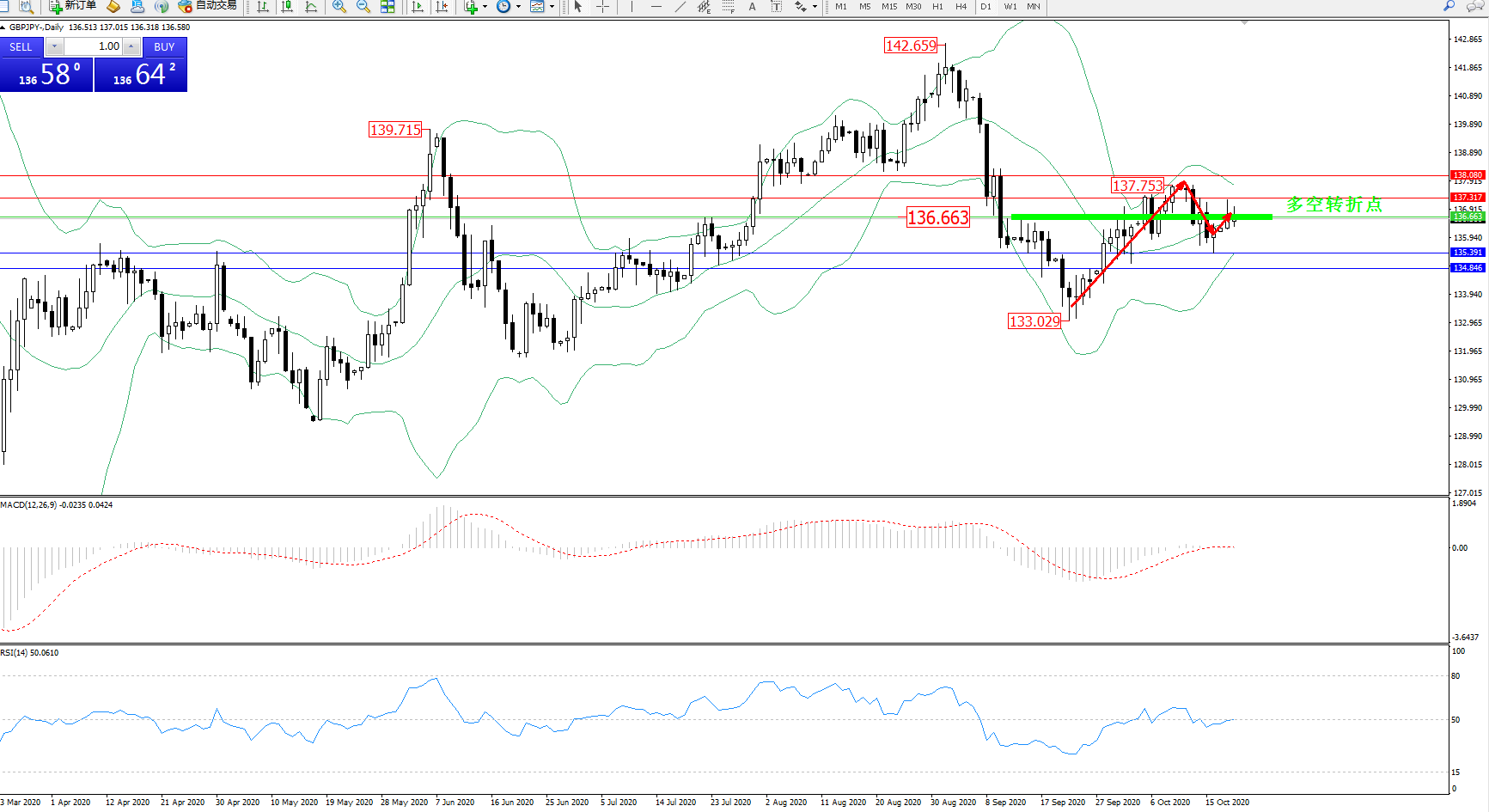 技术点评:低位多头动力持续震荡上扬至137.753位置附近后遇阻,开始震荡回撤,处于中上轨区间高位下行,纠结于中轨附近持续徘徊中,有继续向下移动态势,布林带指标呈收口走势中,MACD指标处于空头区域低位整理回升至0轴线附近弱势徘徊中,RSI指标低位多头动力整理回升至50均衡线后持持续整理平移迹象;