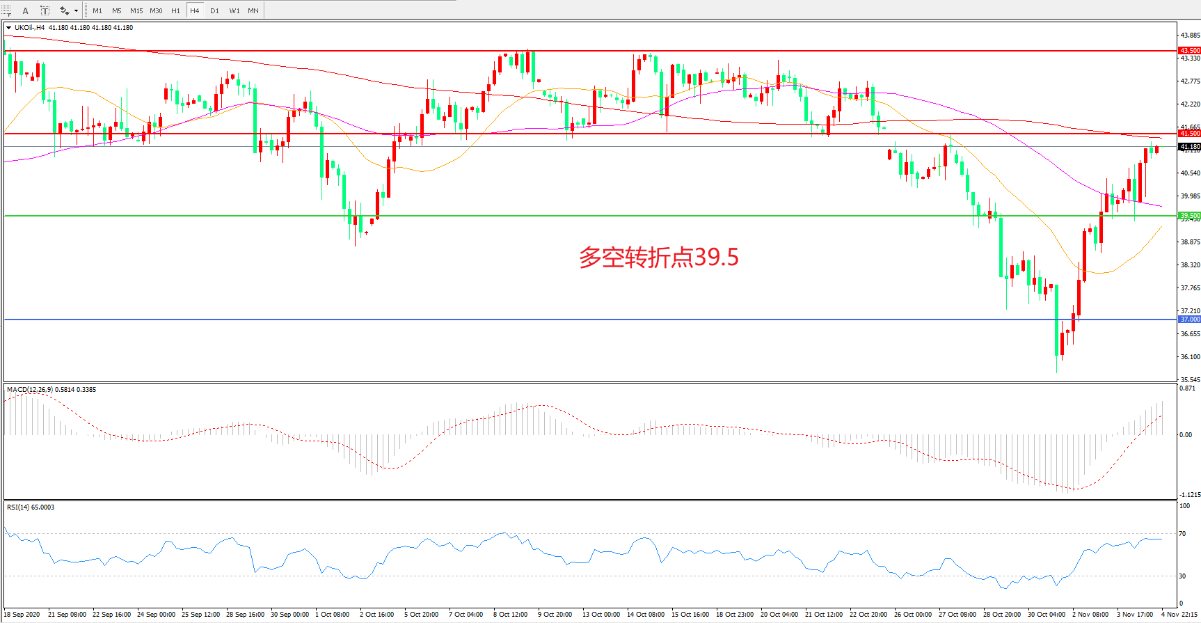 4小时图看,油价低位连续拉升,短期表现有所回暖,39.5美元成为下方支撑,200均线成为上方阻力,MACD红柱增加,RSI指标走平,日内延续上行概率较大。