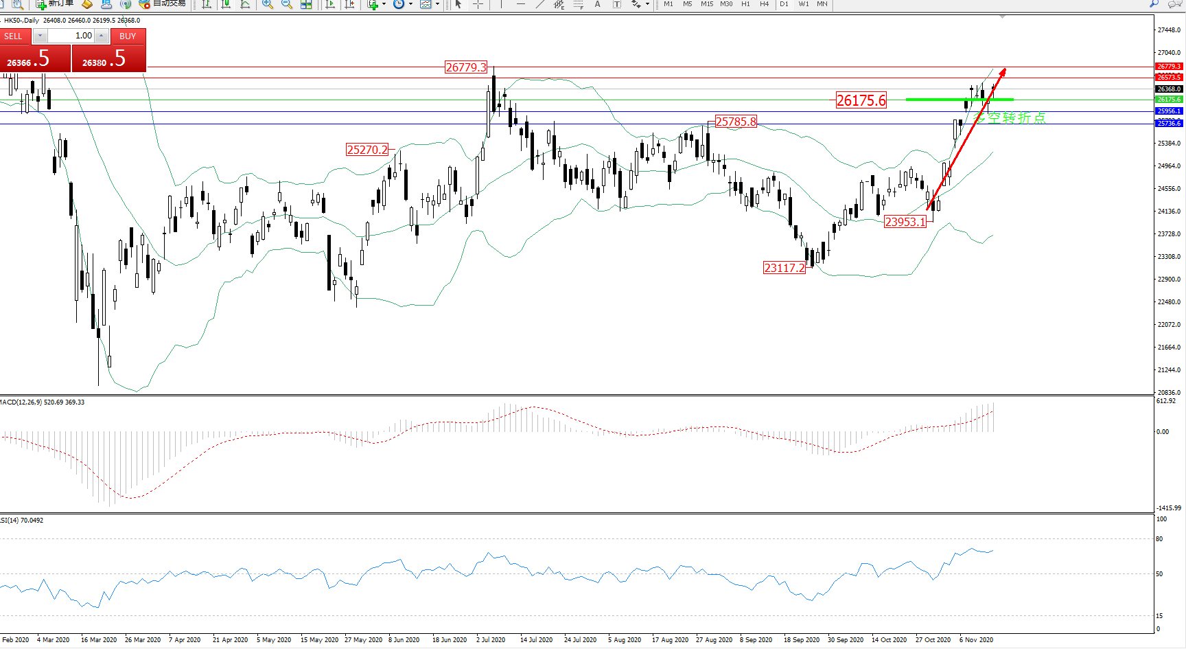 香港恒生指数11月16日(周一)收盘上涨224.81点,涨幅0.86%,报26381.67点;港股主要指数均收涨,恒生科技指数涨1.71%。恒生科技股多数上扬,新东方在线尾盘异动拉升,大幅收涨11%,京东涨5.6%,美团,小米涨4%,腾讯、阿里小幅收跌;电信股继续弱势,教育股、内房股、汽车股普跌。今日南下资金净流入33.07亿港元,大市成交额为1453亿港元。渣打发表研究报告,将香港今年经济预测由原来的按年收缩7.2%,上调至按年下跌5.8%,以反映今年第三季的经济表现好过预期,但相信第四季经济仍将按年收缩1.8%。市场持续憧憬即将有新冠病毒疫苗推出,强化投资者入市意欲。亚太股市今早(16日)造好虽然美国新冠病毒疫情持续恶化,但当选总统拜登无意在全国实施封锁措施,纾缓投资者的忧虑。