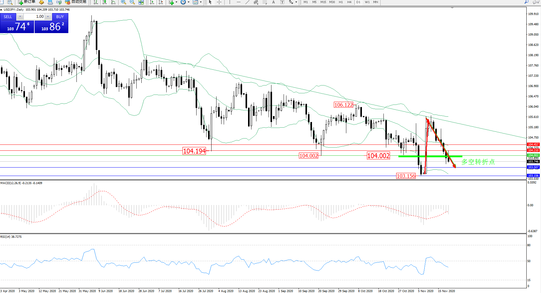 美元兑日圆持续下行至103.746附近震荡,日本官方已释放干预预期,但总体上来看,由于美国选情及疫情负面消息仍然在发酵,避险日元需求依旧坚挺,日本财务大臣麻生太郎讲话,似乎在口头上给日元涨势设定了上限,明确无误地表达了对日元汇价过度走强的担心,随着东京以及日本全国新增病例达到创纪录水平,东京周四将新冠病毒警戒提升至四个级别中的最高级。投资者虽对新冠疫苗持长期乐观态度,但也在担忧感染人数增加以及全球经济复苏脆弱。美国新冠病例激增给美元带来相反的作用力,避险买盘支撑美元,而对货币宽松以提振经济的猜测削弱了美元。