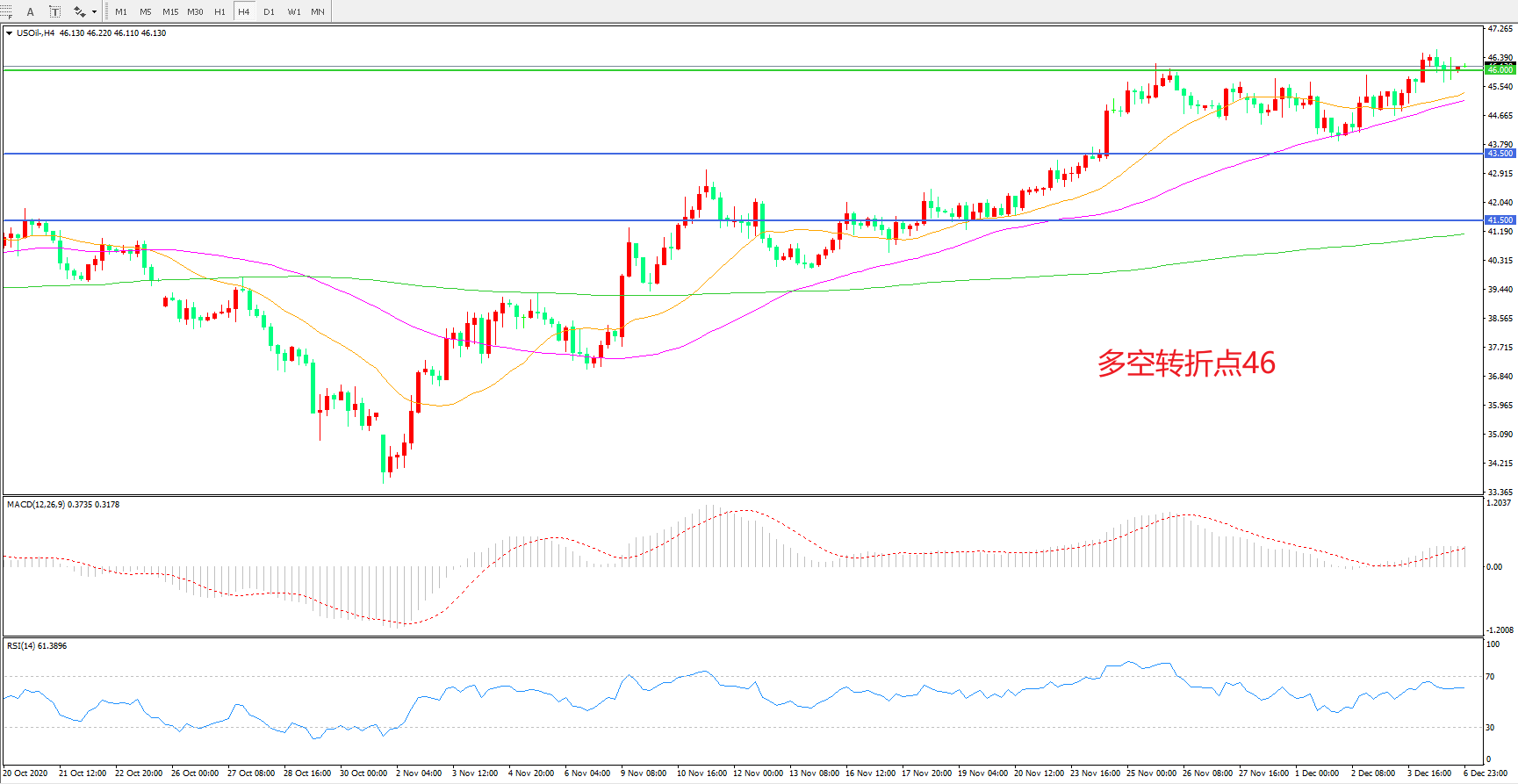 4小时图看,油价延续高位震荡,整体表现相对强势,55周期均线成为短期支撑,46美元成为多空分水岭,MACD红柱减少,RSI指标走平,日内延续震荡概率较大。