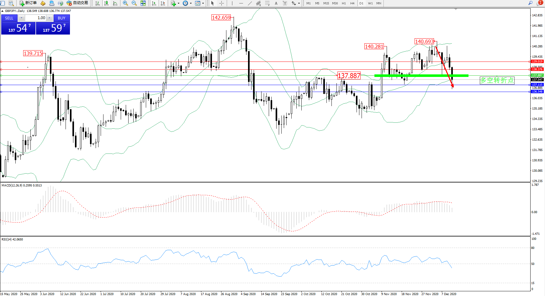 英镑兑日圆持续震荡重挫至137.547附近整理,英国首相约翰逊曾要求与法国总统马克龙和德国总理默克尔通话,但由于贸易谈判将通过委员会进行,欧盟拒绝了通话。意大利总理孔特称,欧盟不能在公平竞争环境问题让步。爱尔兰总理米歇尔·马丁指出,脱欧贸易协定仍面对巨大挑战。达成协议符合爱尔兰、欧盟和英国的最佳利益。投资者期待英欧双方将会在最后一刻达成协议,双方在做出艰难让步之前,可能都在勇敢地面对本国民众。英国央行行长贝利表示,英国企业和家庭可能需要金融体系进一步的支持,以抵御未来的混乱局面,下行风险包括疫情和脱欧过渡,即使结果比预期糟糕得多,英国银行体系仍具有弹性。