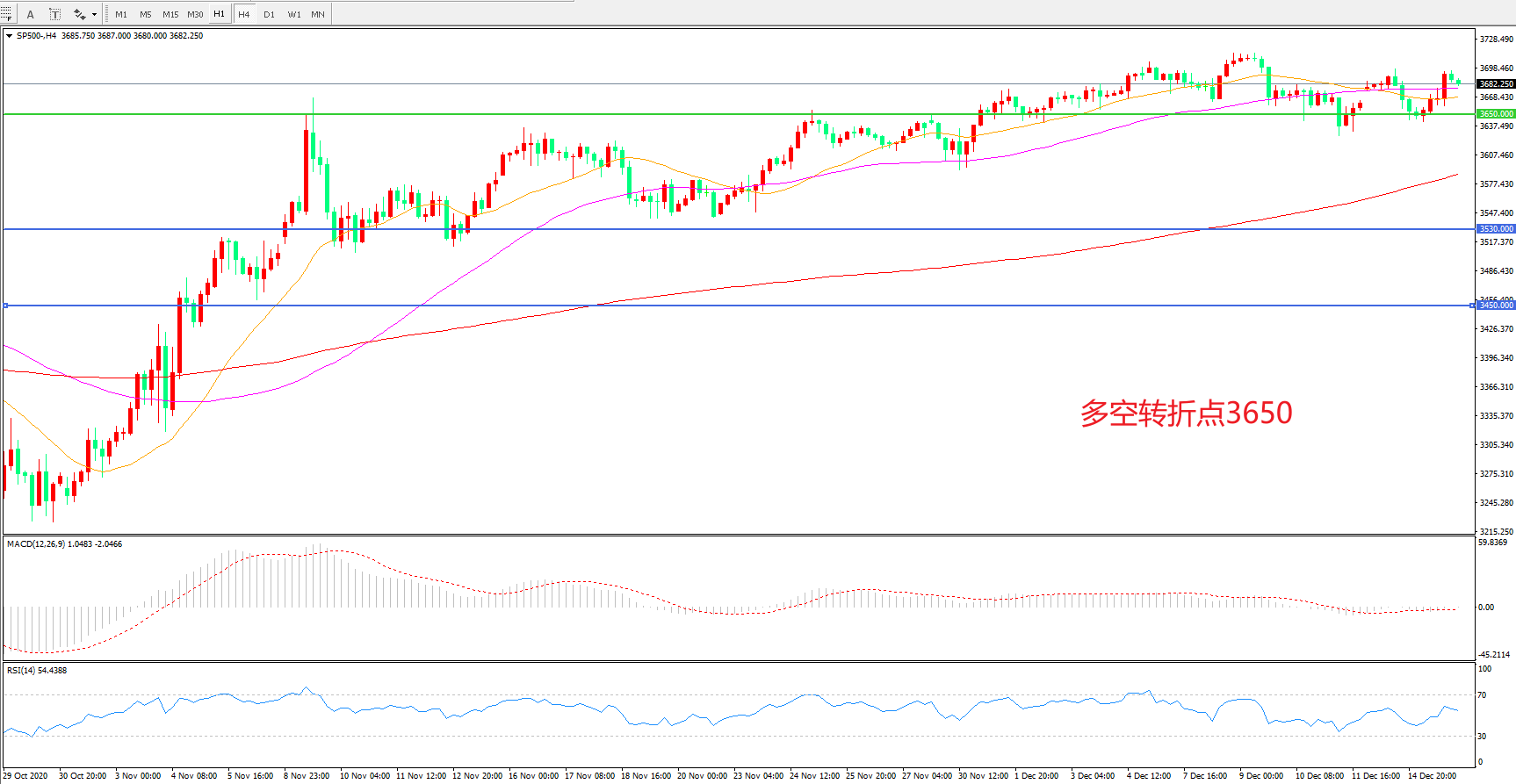 4小时图看,标普500触碰3650支撑后快速反弹,短期表现较为强势,均线系统走平, MACD红柱减少,绿柱增加,RSI指标走平,日内延续震荡概率较大。