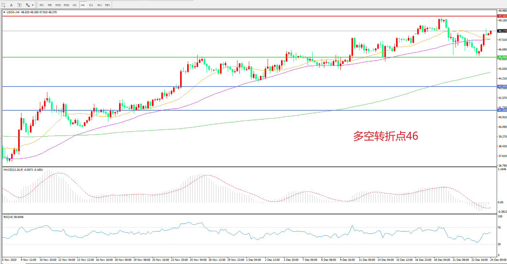 周三(12月23日),美国当周EIA原油库存减少56.2万桶,小于预期和前值,但汽油库存意外减少112.5万桶,市场情绪大幅改善,美国WTI原油大幅反弹,收报48.22美元/桶。临近圣诞假期,原油市场短期之内恐怕不会再有较大的行情,维持短期震荡可能是最终的选择