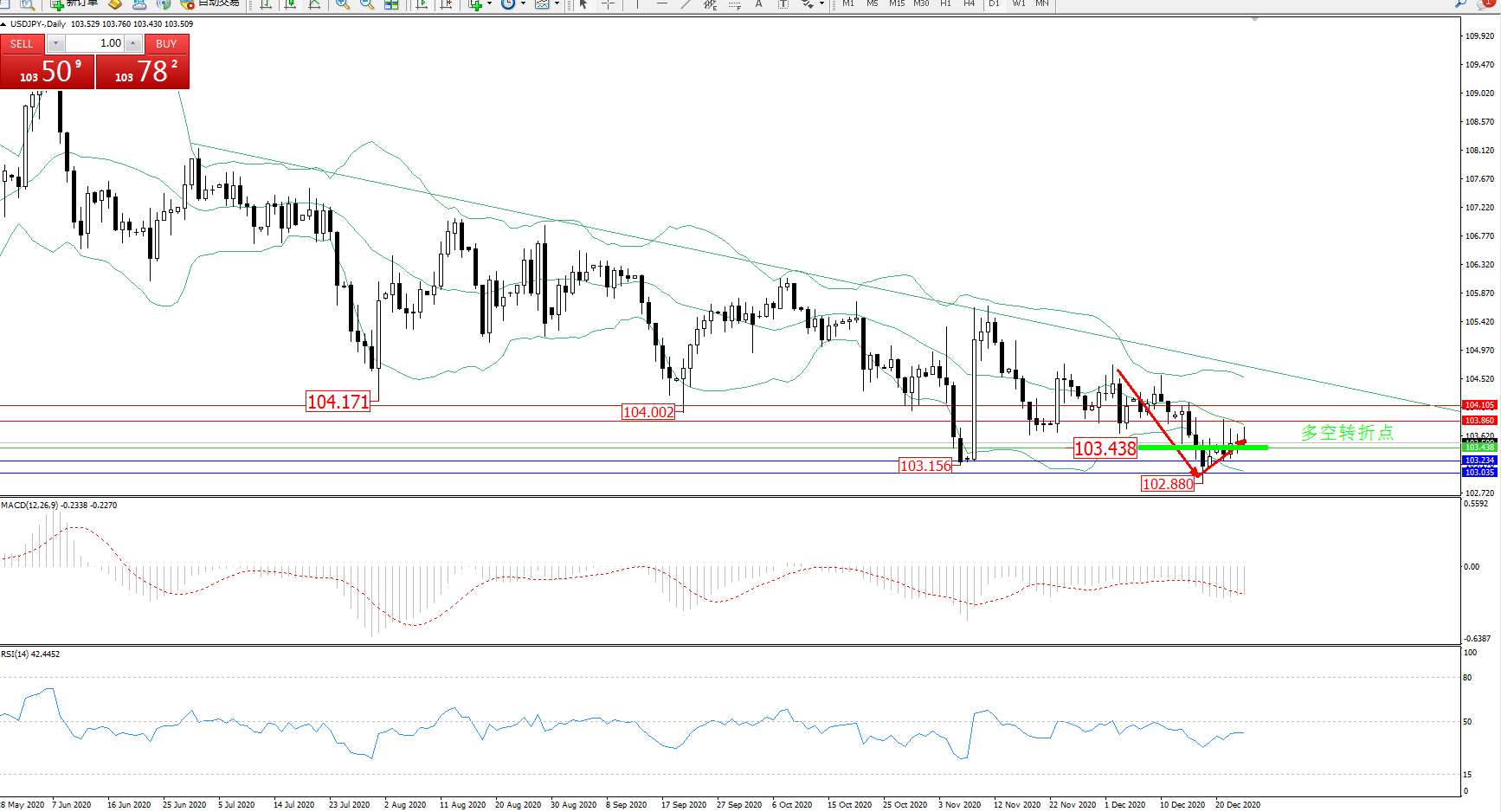 交易策略:103.438上方看涨,目标103.860、104.105