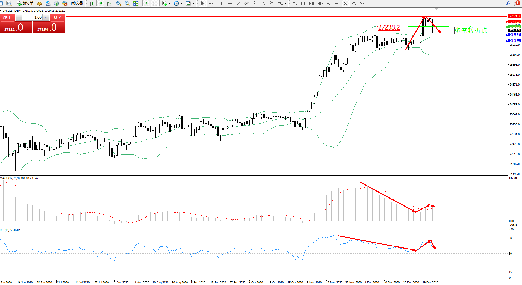 日经225指数1月4日(周一)收盘下跌176.67点,跌幅0.64%,报27267.50点。日本首相菅义伟:希望在2月底之前开始接种新冠疫苗。我也将是第一批接种疫苗的人员。敦促国民避免非必要外出。将继续实施以增长为目标的政策。希望尽快会见美国当选总统拜登。将继续准备举办东京奥运会。目前的工作重点是渡过疫情危机。决心举办东京奥运会。希望强化日美关系。希望尽快通过常规和额外预算。考虑在时间期限内举行选举。现在讨论下议院选举仍为时尚早。据日本富士新闻网:日本政府考虑自1月9日起实施为期一个月的紧急状态。日本东京新增884例新冠肺炎确诊病例。日本兵库县新增118例新冠肺炎确诊病例。