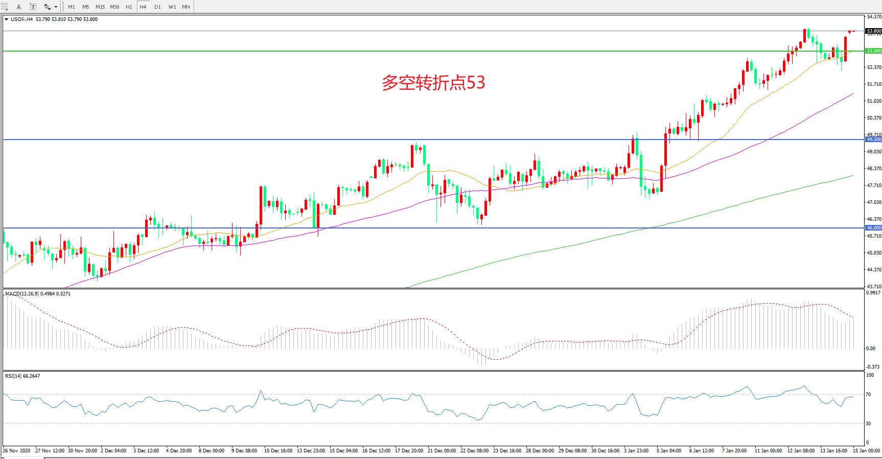 周四(1月14日),美国总统拜登公布了“美国拯救计划”, 建议实施3500亿美元州政府救助、向新冠肺炎疫苗(接种)和病毒筛检提供1600亿美元资金等措施,总刺激金额高达1.9万亿美元,市场风险情绪受到提振,美国WTI原油大幅拉升,早盘跳空高开,收报53.80美元/桶。
