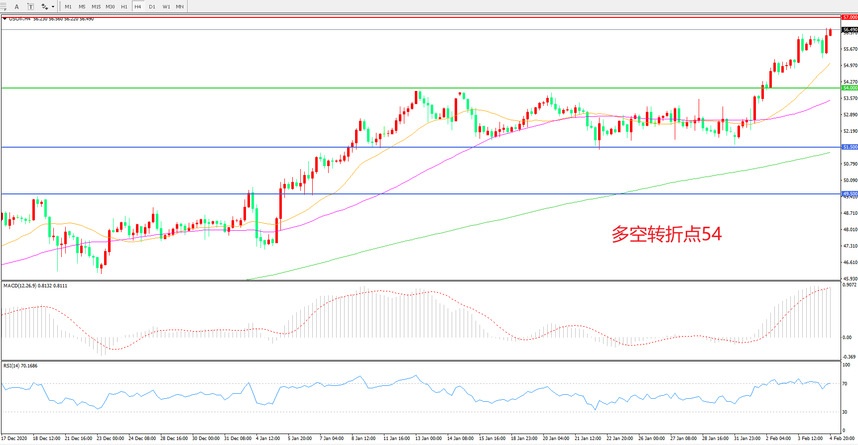 4小时图看,油价连续拉升,整体表现偏强,54阻力被快速突破后,多头趋势正在形成,MACD红柱增加,RSI指标向上,日内延续上行概率较大。