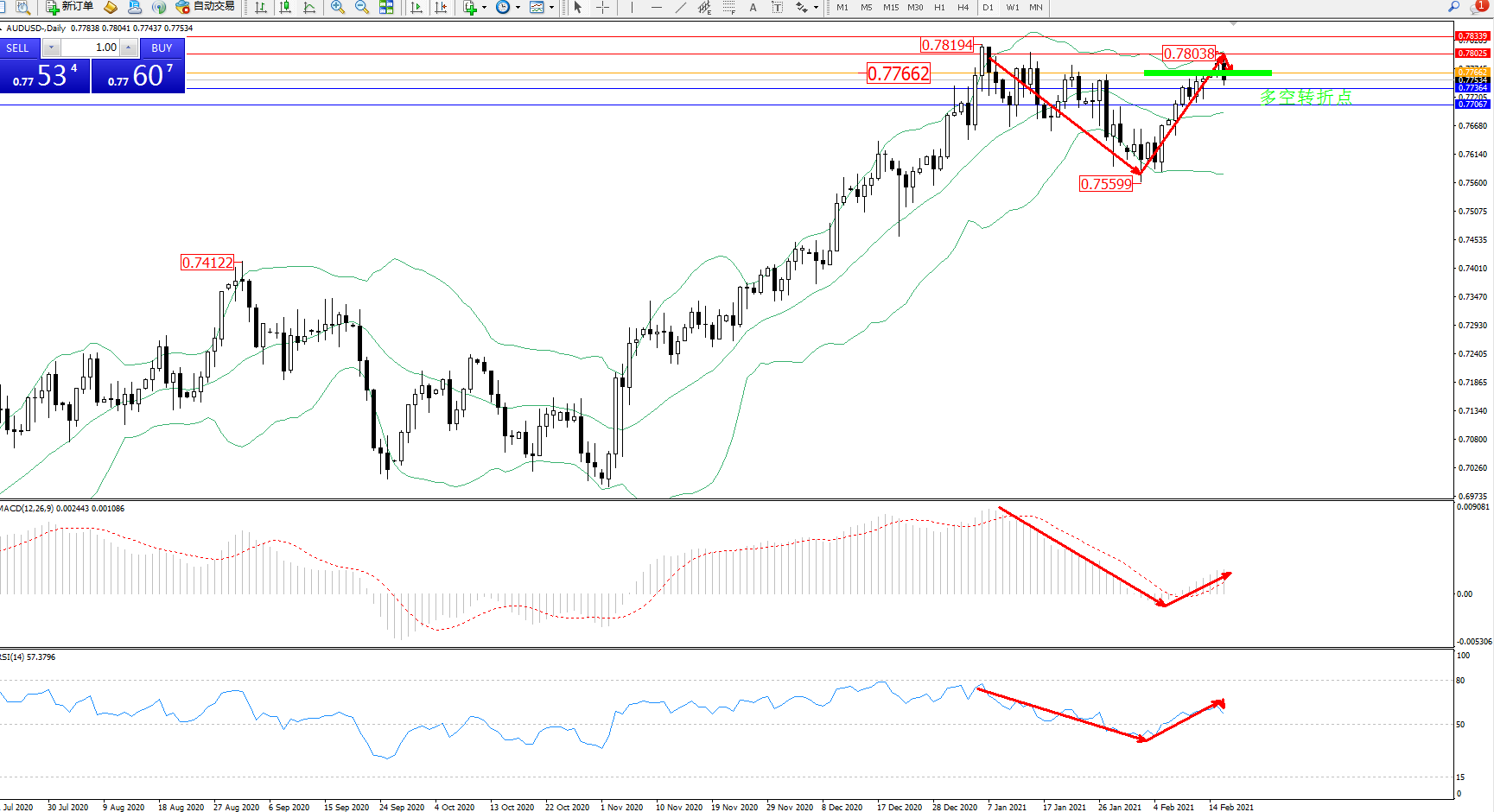 备选策略:0.77662上方看涨,目标0.78025、0.78339