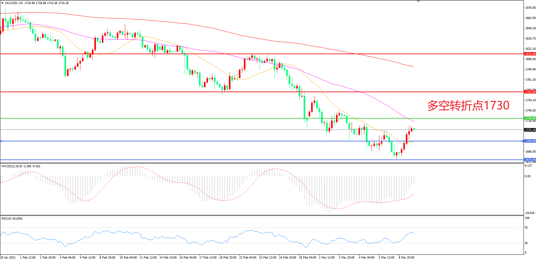 周二(3月9日),市场风云突变!美国10年期国债收益率突然回落,美元指数自近期高点大幅回落至92关口下方,随着美债收益率和美元双双下行,贵金属市场也疯狂反击,现货黄金大幅上涨逾40美元,收报1715.80美元/盎司。本周,美国财政部将拍卖580亿美元三年期国债,需警惕美债收益率进一步飙升的可能性。