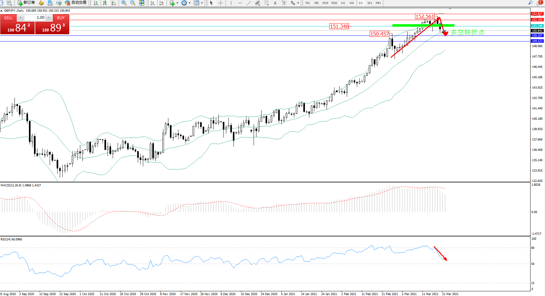 技术点评:多头动力延续布林带指标通道中上轨区间持续震荡上扬,高位抵达152.561位置节点遇阻后震荡下行,触及中轨附近节点后开始震荡,短期或继续向下移动,布林带指标呈上行趋势走势持续,MACD指标处于多头区域高位整理平移后有下移迹象,RSI指标高位空头动力维持震荡下行持续中;