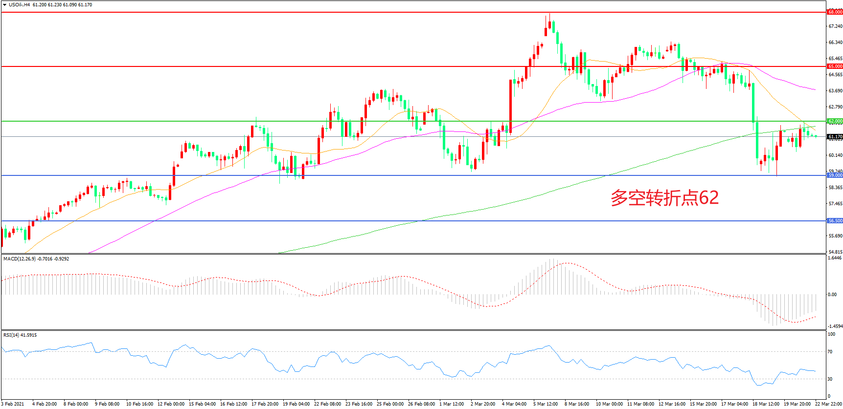 周一(3月22日),欧洲部分国家延长封锁措施后油品需求下降,对需求放缓的担忧逐渐笼罩市场,而伊朗及利比亚原油的增产可能令多头继续承压,美国WTI原油高位震荡回落,收报61.20美元/桶。近期欧洲部分国家第三波疫情的严重程度将逐渐影响到油价的走势,成为拖累油价的主要利空因素。