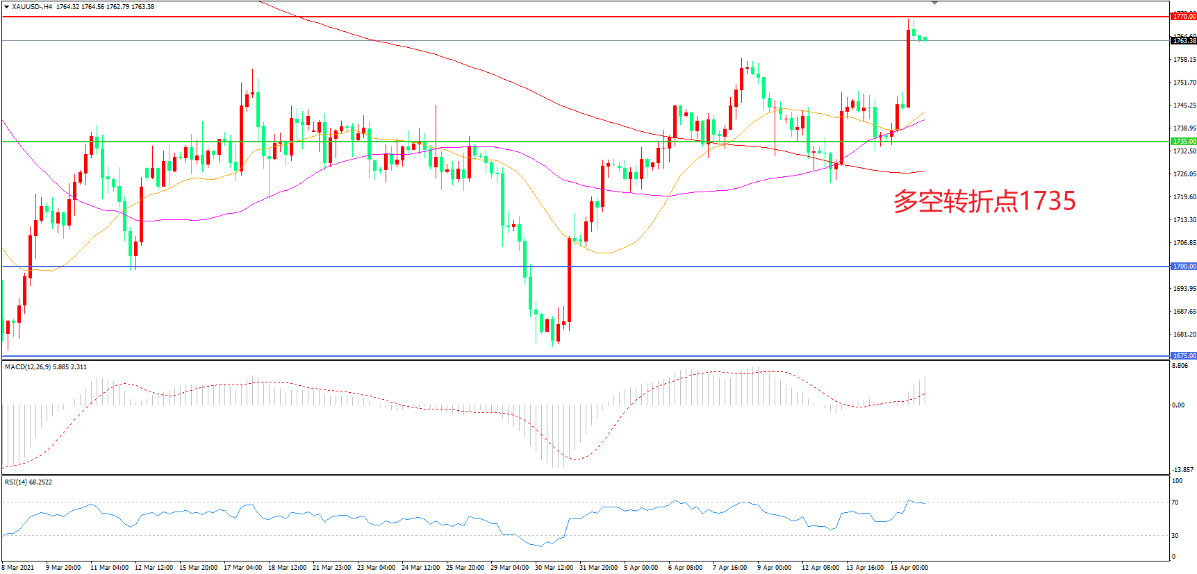 周四(4月15日),美国3月零售销售超预期环比激增,但强劲的美国数据未能阻止美债收益率继续下滑,美国国债、尤其是长期美债的收益率大幅下降,现货黄金受到提振,一度涨超2%,小幅回落后收报1763.59美元/盎司,创下2月25日以来收盘新高。此前美联储公布的经济状况褐皮书也显示了美国经济的现况,美国经济活动增长步伐有所加快,消费者支出出现改善,但与此呼应的是,美国通胀也在加速上行。