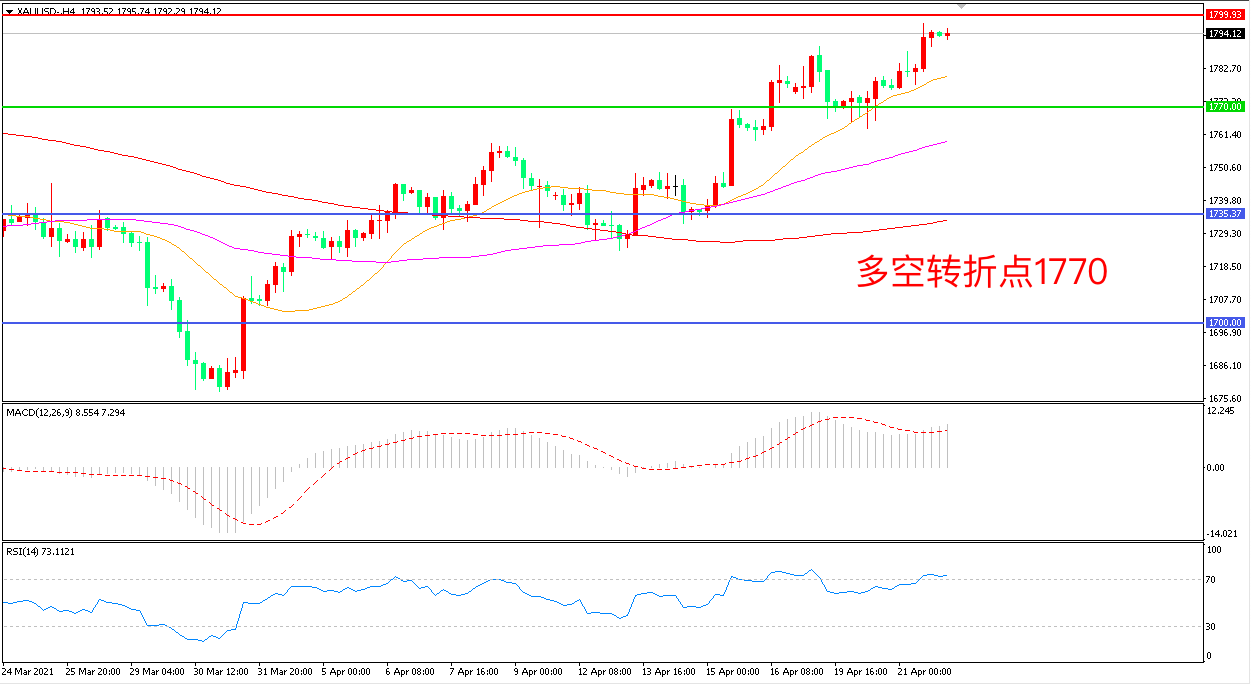 交易策略:在1770.00之上看涨,目标1800.00 1840.00