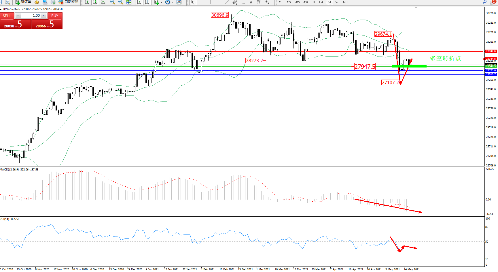 日经225指数5月18日(周二)收盘上涨598.17点,涨幅2.15%,报28423.00点。日本财务大臣麻生太郎:对全球经济前景不太担忧。 各个国家经济复苏将会不同。私人消费(下降)是第一季度GDP收缩的主要因素。延长股票交易时间的说法并不新奇。讨论证券行业的长期交易很重要。政府报告显示,日本第一季度GDP在过去3个季度来首次出现萎缩。日本出口增长主要由于电子零件和机械的增长。一季度出口连续第三个季度实现增长。日本经济再生大臣西村康稔:服务支出疲软,但商品支出强劲。政府将灵活采取行动,包括动用储备基金。日本央行提出从5月19日开始直接购买1万亿日元的短期国库券。日本经济具备恢复的潜力。日本经济声明:必须警惕新紧急状态限制措施对经济的影响。海外经济复苏导致出口继续增加。