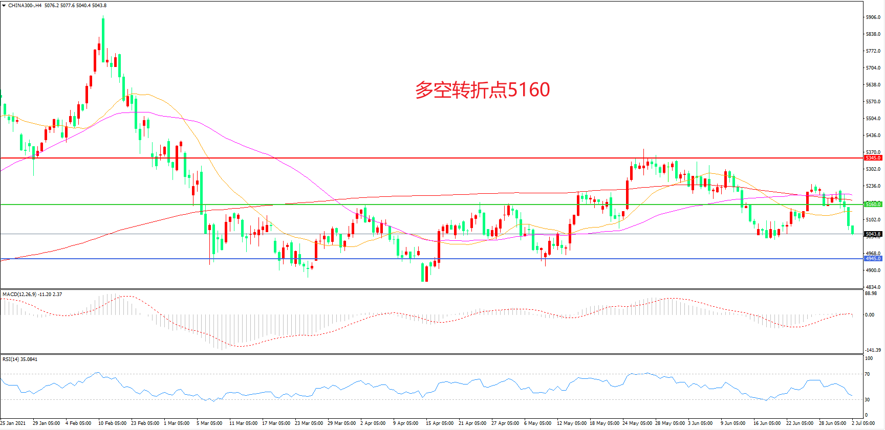 4小时图看,沪深300小幅冲高后连续下破,整体表现较为低迷,均线系统走平形成上方阻力,5160成为多空分水岭,MACD绿柱增加,RSI指标向下,日内震荡下行概率较大。