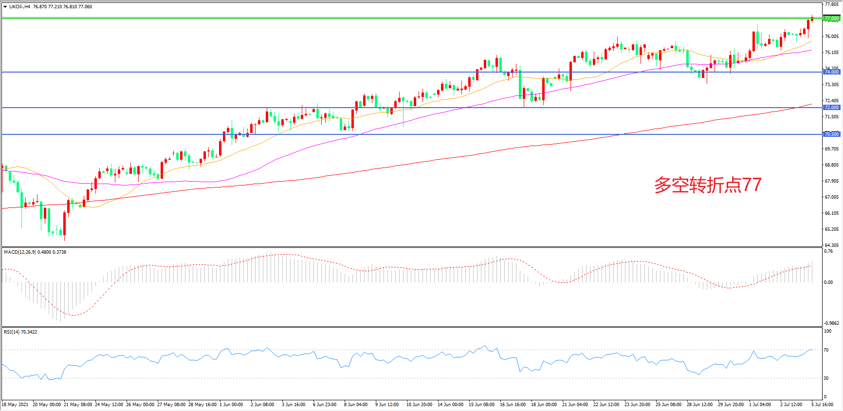 周一(7月5日),经过数日的密集磋商,OPEC+仍未能化解OPEC两大核心成员国沙特和阿联酋之间的分歧,会谈陷入僵局的直接影响是:OPEC+ 8月可能不会增产!OPEC+取消会谈的消息传出后,布伦特原油震荡上行,收报77.06美元/桶,续刷2018年10月以来新高。在原油现货市场异常紧俏的情况下,如果8月份不增产,将很容易导致供应短缺,油价保持上行概率较大。