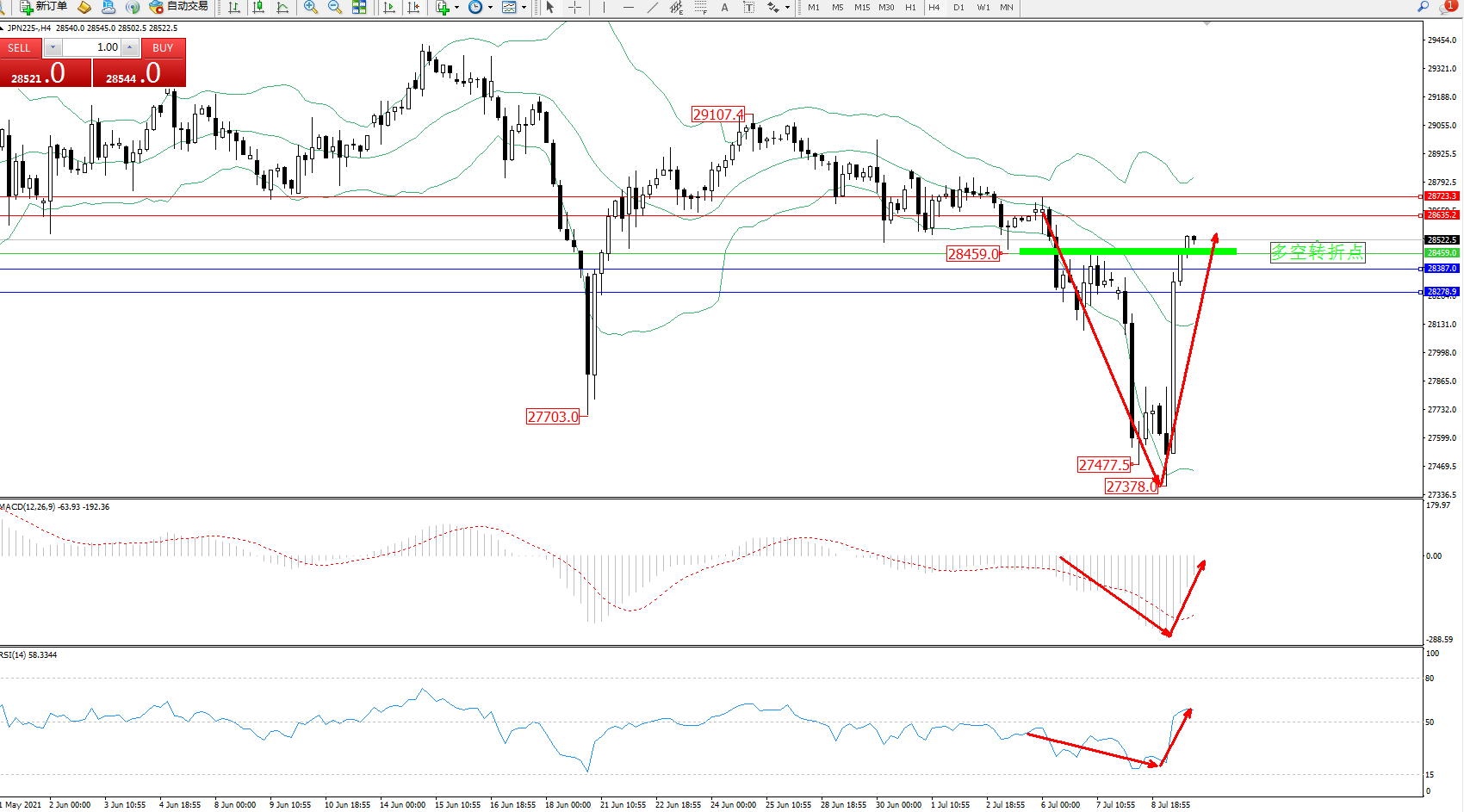 技术点评:空头动力延续布林带指标下轨附近强势下挫后,低位抵达27378位置得到支撑强势反转上扬,呈V型走势不断向上移动中,处于布林带指标中上轨区间震荡中,布林带指标呈收口走势持续中,MACD指标处于空头区域低位强势拉升中,RSI指标低位多头动力强势震荡上扬突破50均衡线进入多头区域徘徊中;