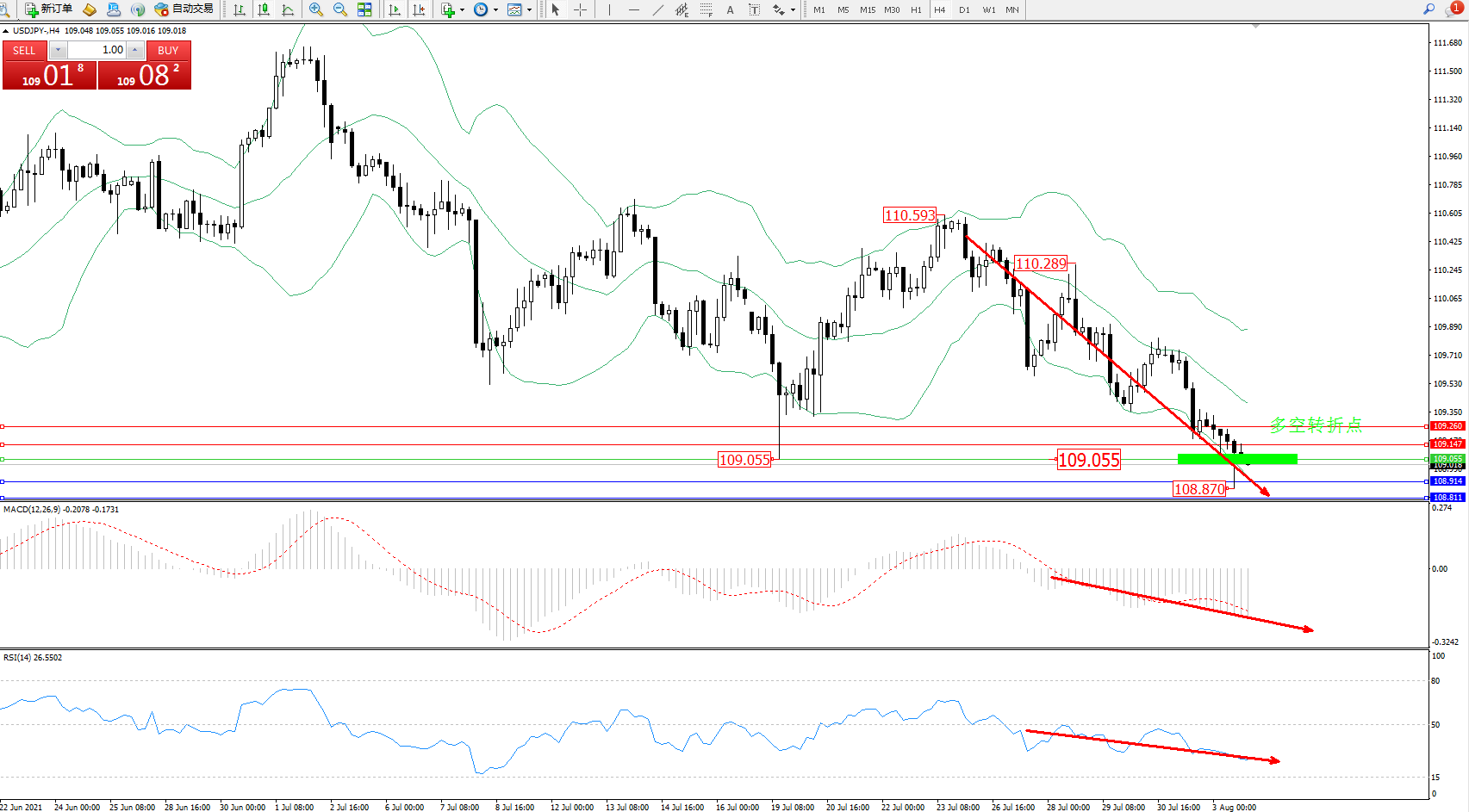 技术点评:空头动力延续布林带指标通道中下轨区间持续震荡下行,低位抵达108.870位置后短暂回升,但下行趋势态势良好,依旧有进一步向下移动态势,前期低位已然破位,布林带指标呈下行趋势走势持续中,MACD指标处于空头区域不断下移,RSI指标处于看头区域持续震荡下行;