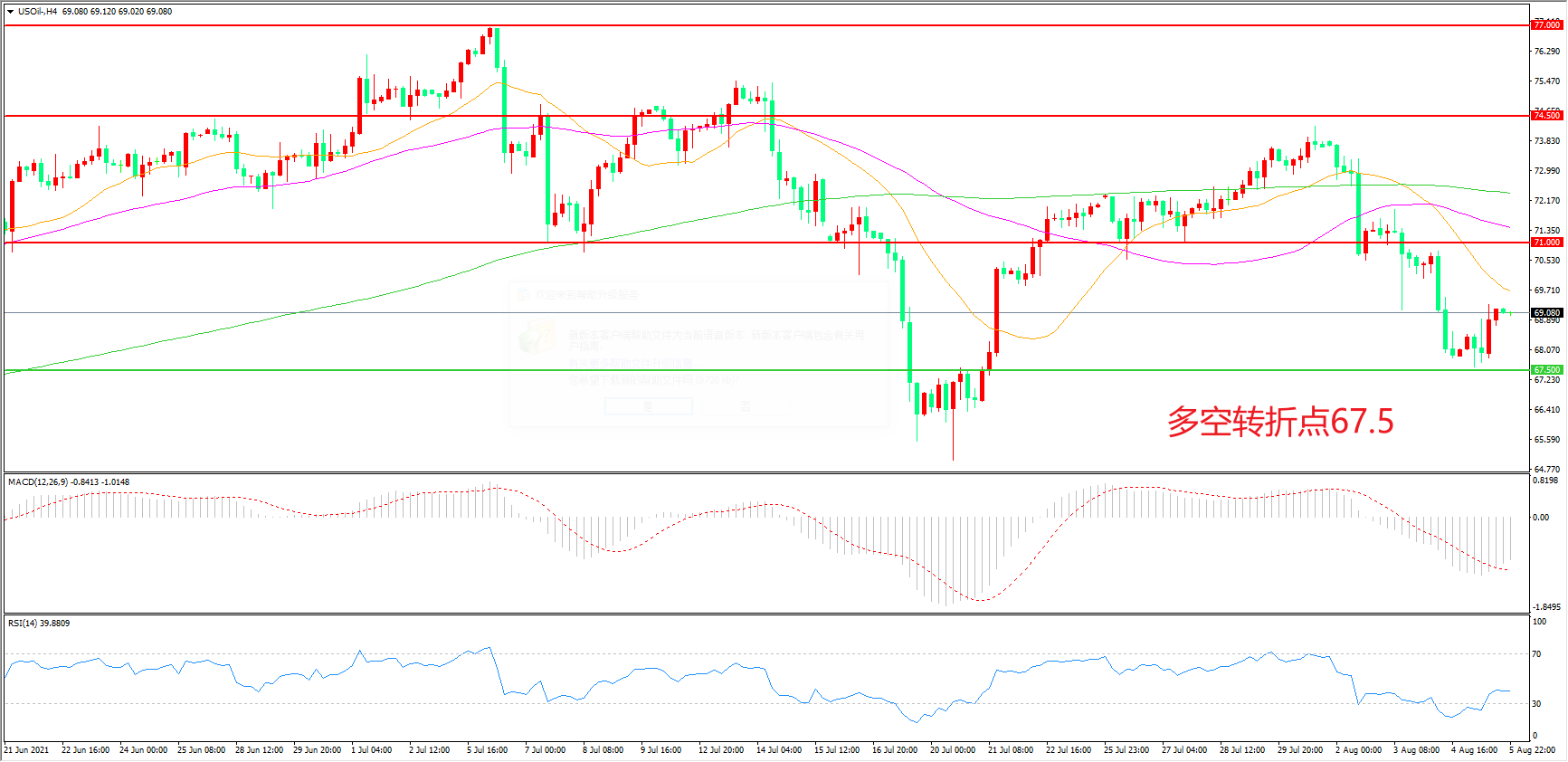 周四(8月5日),因中东局势紧张盖过了人们对Dleta病毒的担忧对全球能源需求造成的冲击,美国WTI原油在盘中短暂下探之后快速收回,收报69.06美元/桶。从市场的表现上来看,虽然价格在67.5美元附近获得了支撑,但是市场情绪仍然不高,如果按照预期交易,需要等到市场消化这一阶段的情绪,对于当前的原油价格来说,震荡下行大概率依然较大。