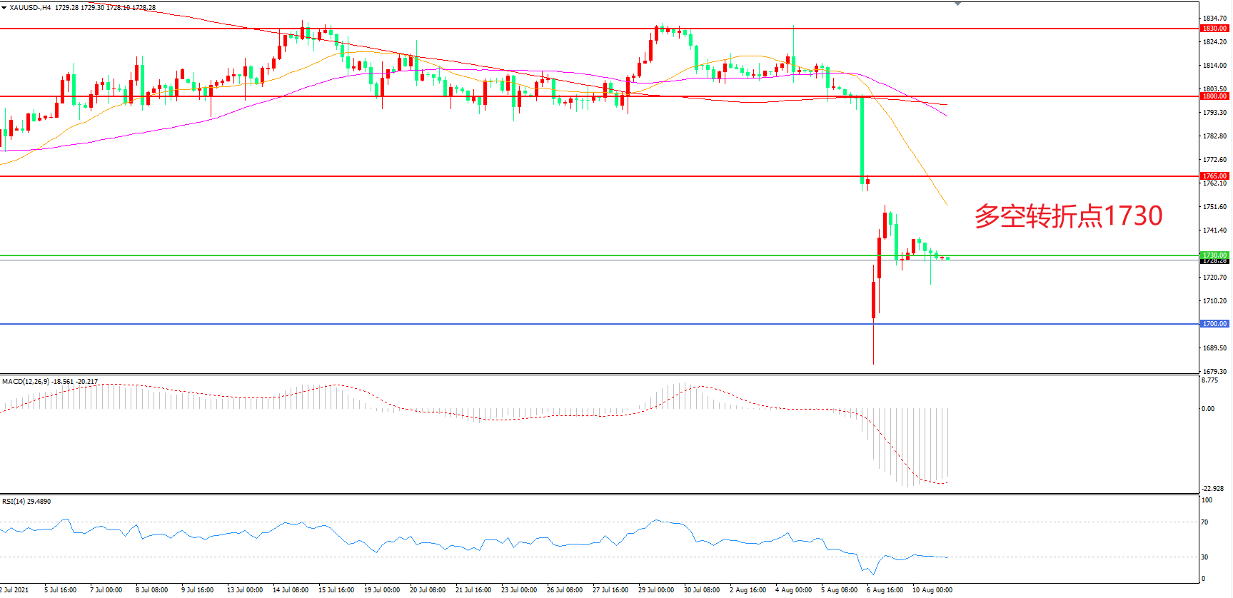 周二(8月10日),美国参议院投票批准万亿美元的基建议案,美元指数触及三周以来的新高,现货黄金窄幅震荡,收报1728.10美元/盎司。尽管前一日金价的闪崩有流动性不佳的影响,但强劲的美国就业数据巩固了市场对于缩减购债的预期,日内公布的美国通胀数据如果再度向好,黄金可能再度迎来大跌。