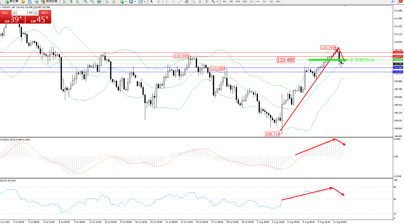 技术点评:多头动力延续布林带指标通道中上轨区间强势拉升上扬后,高位抵达110.792位置遇阻回撤,触及布林带指标中轨位置后有继续下行态势,短期空头动力开始强势入场,布林带指标呈收口走势中,MACD指标处于多头区域持续拉升后高位开始转势下行,RSI指标即将触及超买区80均衡线后急速下挫;
