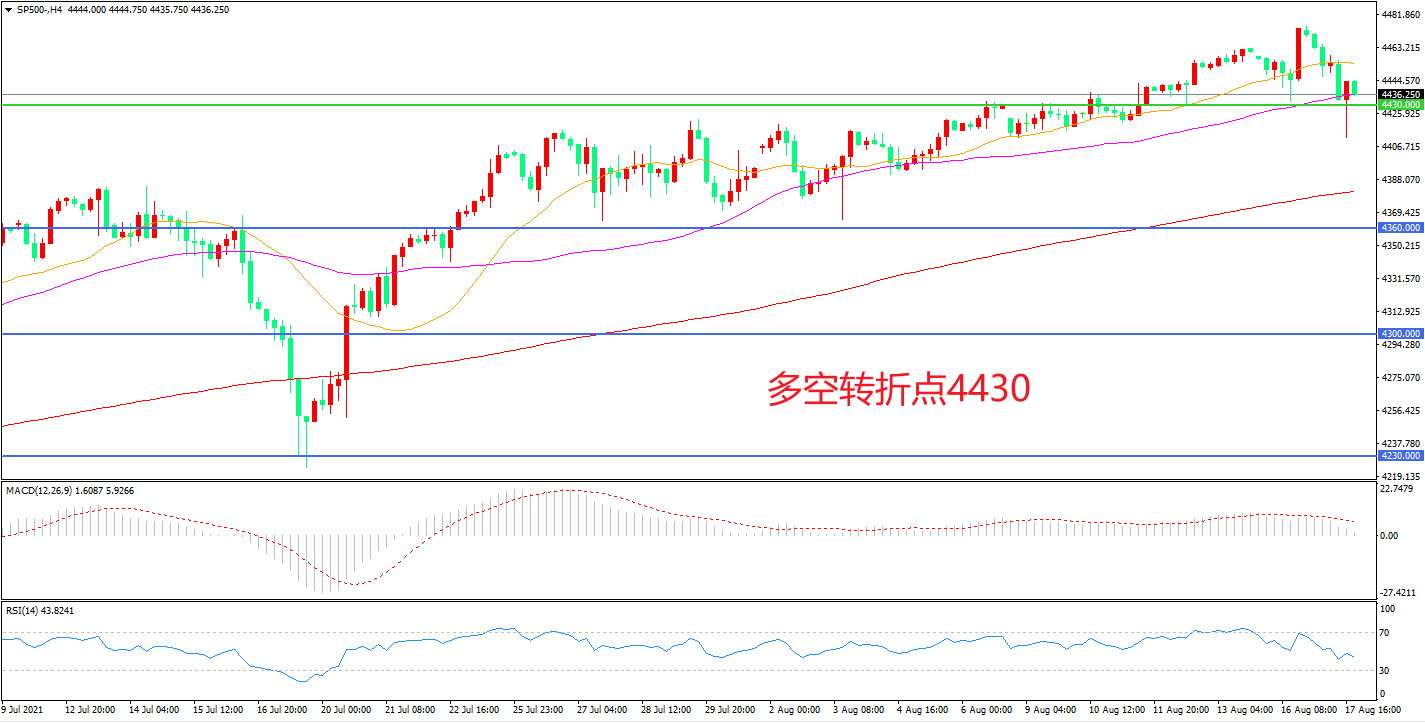 4小时图看,标普500呈现震荡回落形态,但55周期均线收复后,上行结构依然依然完好,4430成为下方支撑,MACD红柱缩短,RSI指标走平,日内震荡上行概率较大。