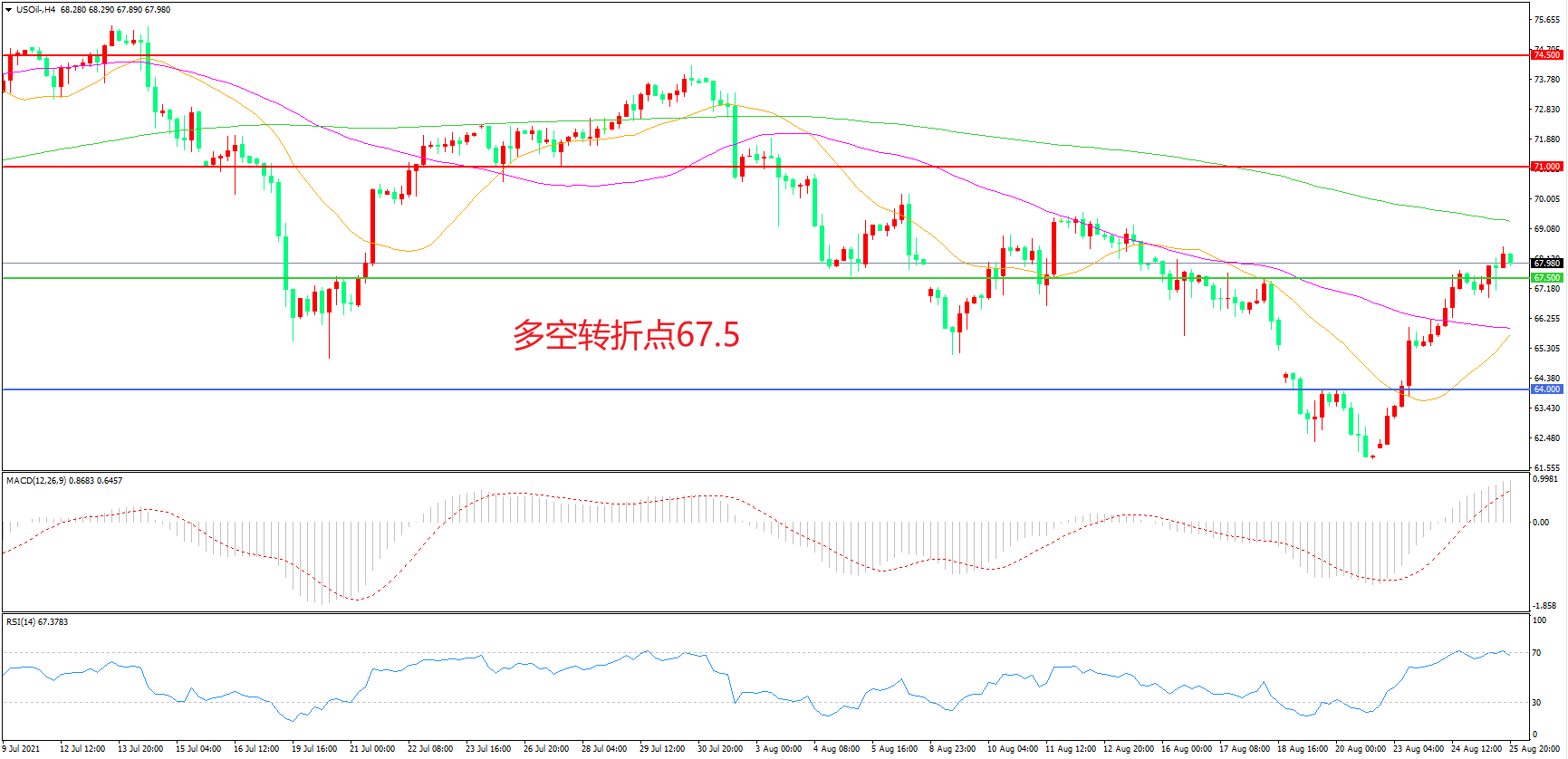 周三(8月25日),根据美国能源信息署公布的数据显示,当周EIA原油库存减少298万桶,超过市场预期,美国WTI原油震荡走高,收报68.03美元/桶。近期油价上涨的主要原因一方面是墨西哥一个石油平台发生火灾,另一方面杰克逊霍尔央行年会的到来使得此前获利颇丰的多头选择了获利平仓,鲍威尔在年会上发言可能直接为中期的金融市场奠定基调,务必重点关注。