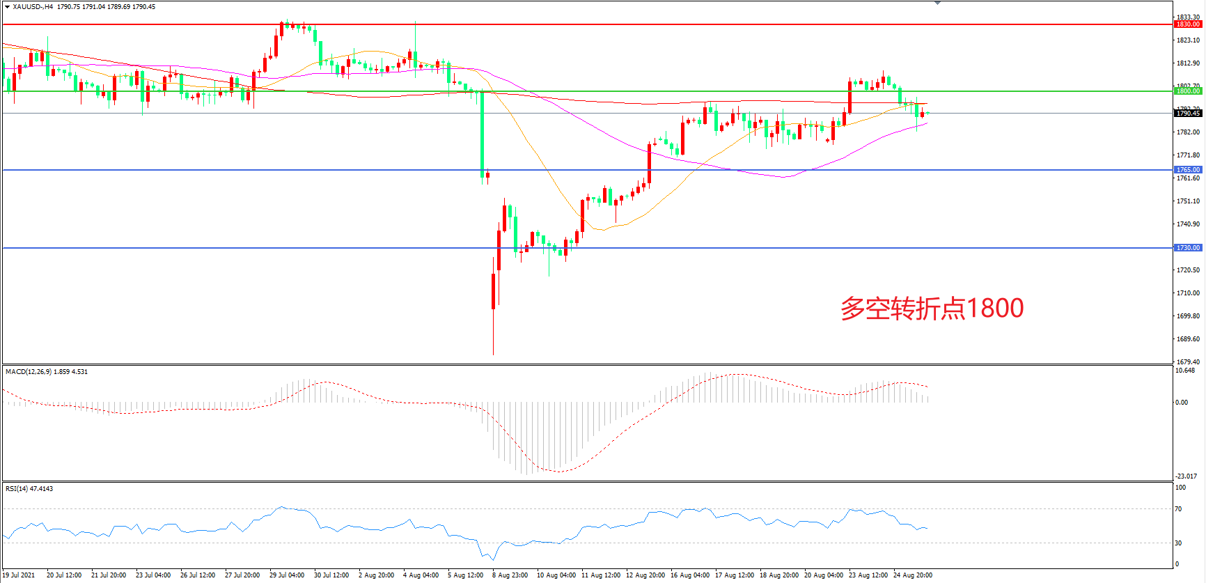 4小时图看,金价高位震荡后小幅回落,短期涨势暂缓, 55周期均线成为下方支撑,1800美元成为多空分水岭,MACD红柱缩短,RSI指标走平,日内震荡上行较大。