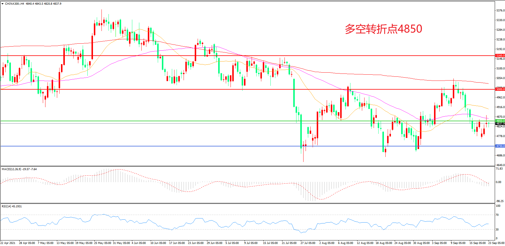 4小时图看,沪深300呈现冲高回落形态,短期行情陷入震荡,均线系统成为阻力,4850成为短期多空分水岭,MACD绿柱增加,RSI指标走平,日内延续震荡概率较大。