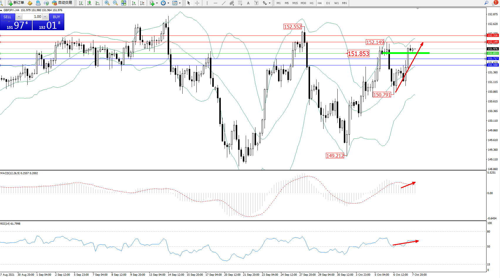 技术点评:多头动力延续布林带指标通道中上轨区间持续震荡上扬,高位触及布林带指标上轨附近后短暂整理,有继续攀升态势,布林带指标呈上行趋势良好,前期高位152.552位置近在咫尺,破位在即,MACD指标处于多头区域维持整理平移中,RSI指标处于多头区域维持整理徘徊中;