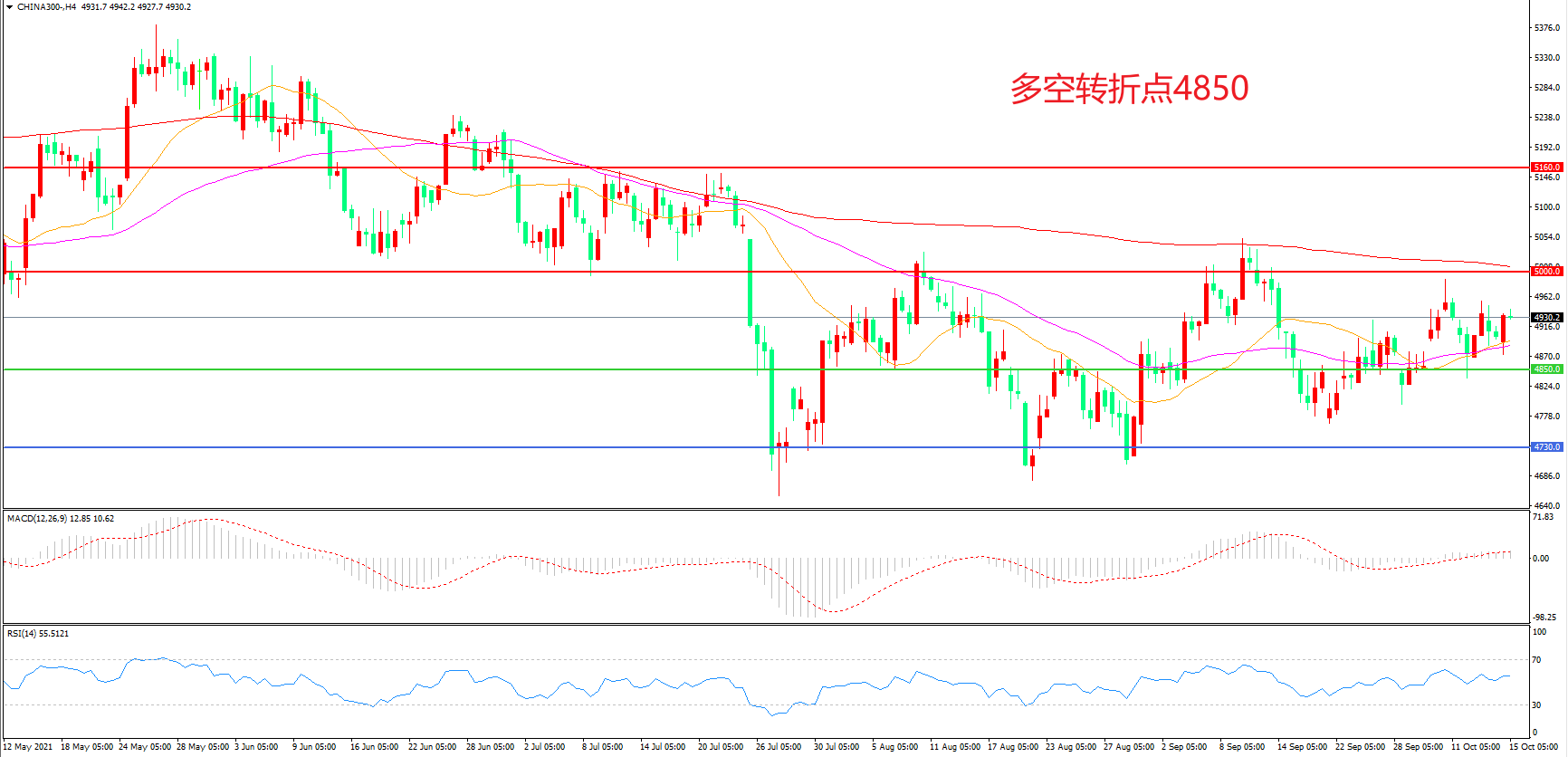 4小时图看,沪深300区间震荡迹象明显,均线系统成为下方支撑,5000点成为上方阻力,MACD红柱缩短,RSI指标走平,日内延续震荡概率较大。