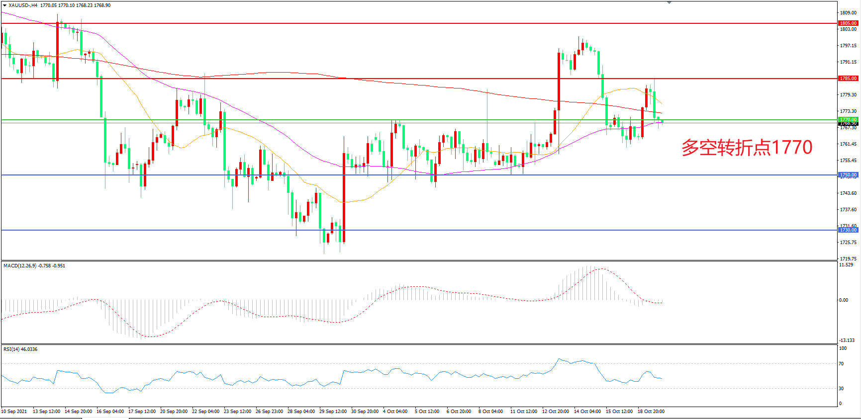 周二(10月19日),美联储高官密集发声对市场形成冲击,其中美联储理事沃勒表示美联储应在11月会议后开始缩减资产购买引发投资者担忧,货币宽松退潮的预期导致金价冲高回落,收报1768.90美元/盎司。目前美国国债收益率飙升和美元走高对黄金形成了双重压力,日内黄金延续区间震荡概率较大。
