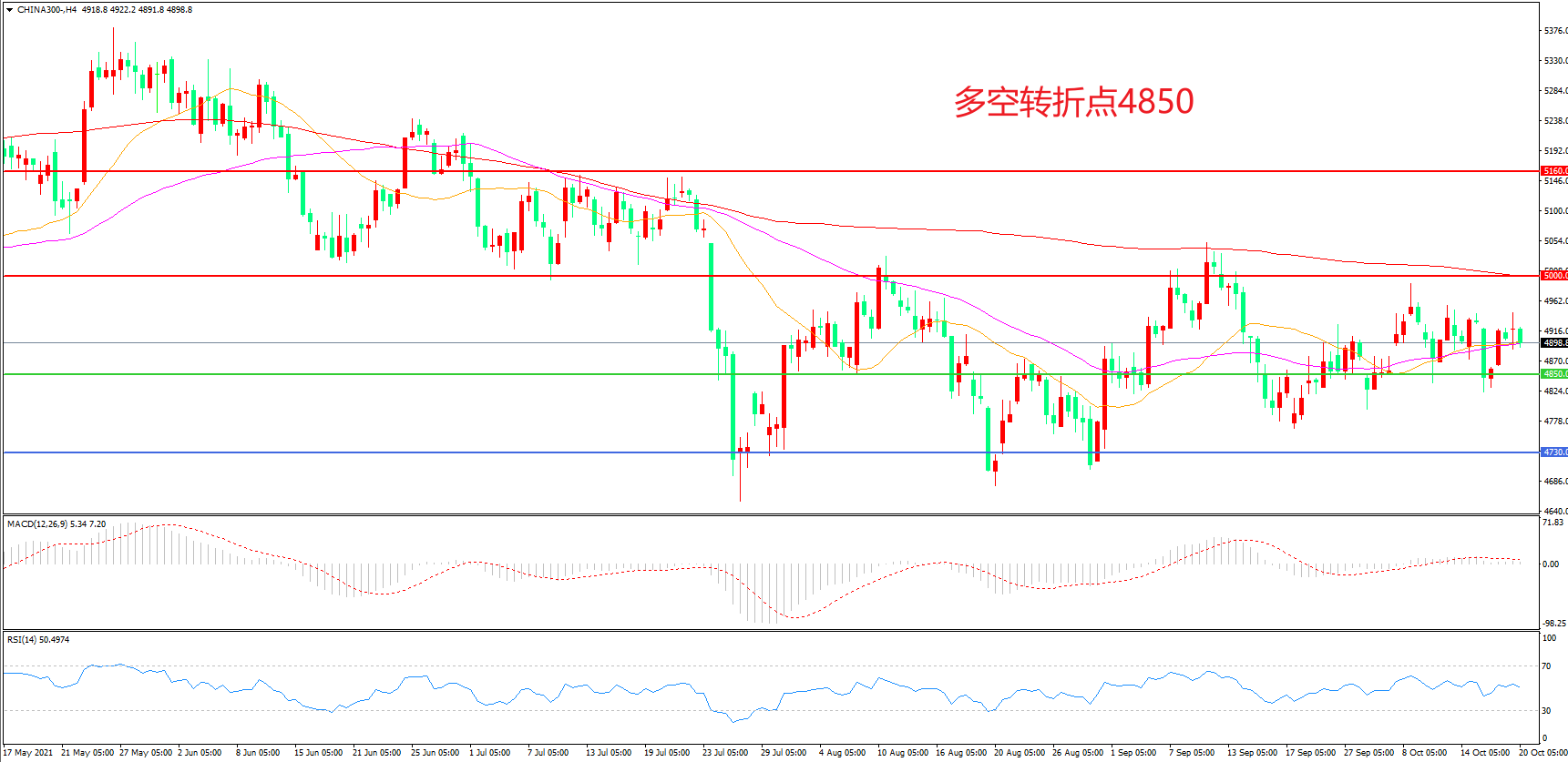 4小时图看,沪深300以均线系统为依托横盘震荡,5000点成为上方阻力,4850成为下方支撑,MACD红柱缩短,RSI指标走平,日内延续震荡概率较大。