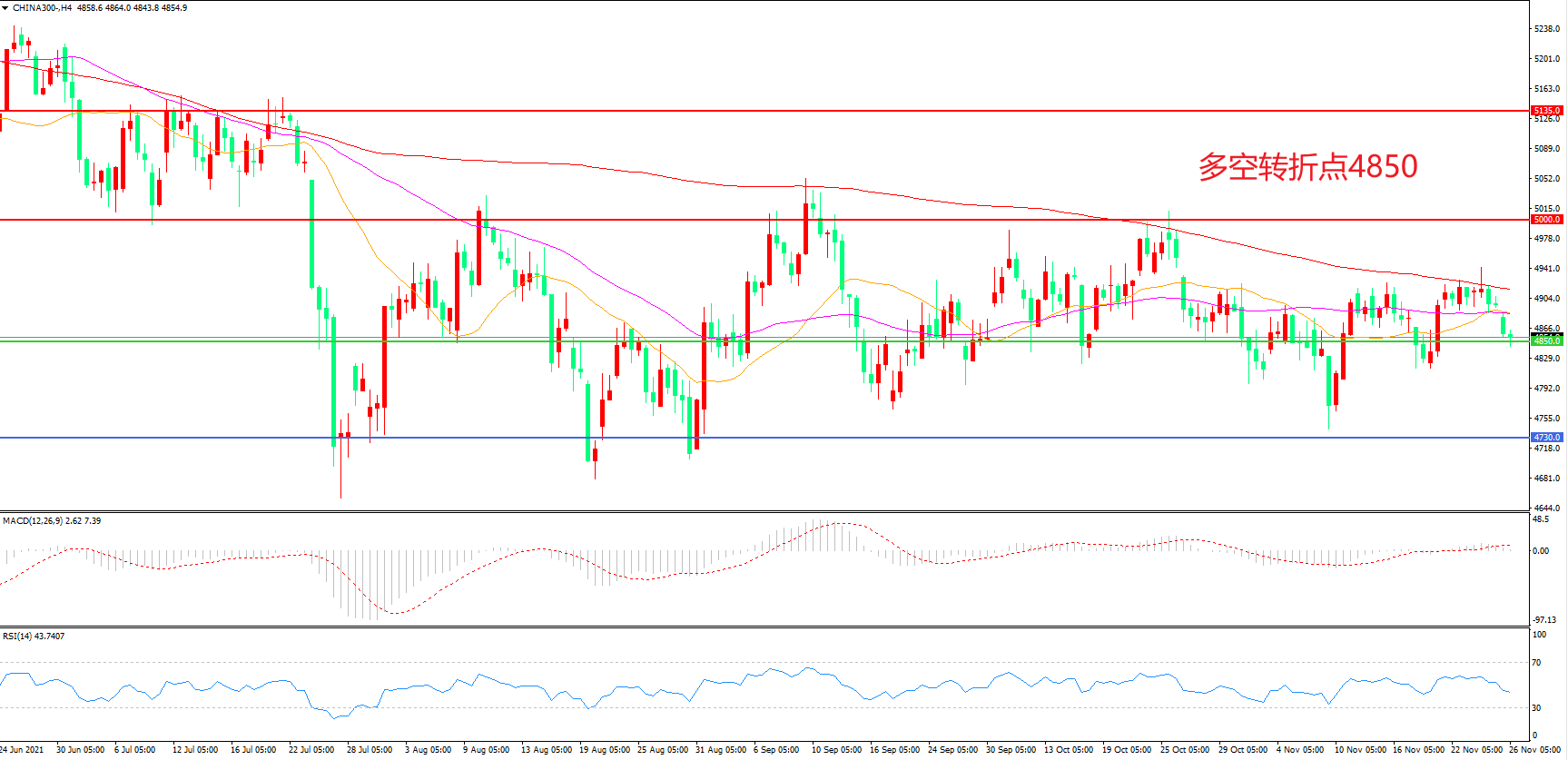 4小时图看,沪深300高位震荡,短期走势低迷,200周期均线成为阻力,4850成为多空分水岭,MACD红柱缩短,RSI指标走平,日内延续震荡概率较大。