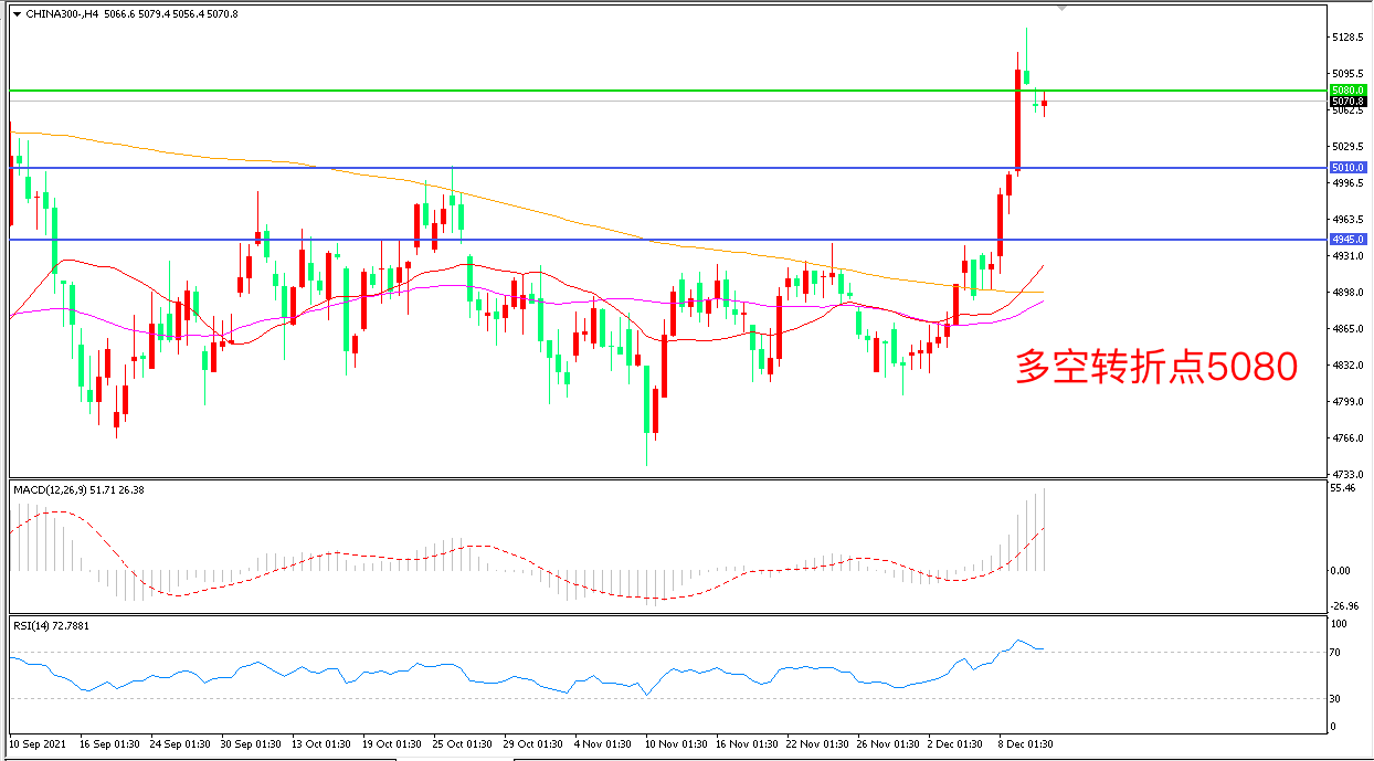 4小时图看,沪深300长阳后低开震荡,短期走势出现调整,5010形成下方支撑,5080成为多空分水岭,MACD红柱增加,RSI指标走平,日内震荡上行概率较大。