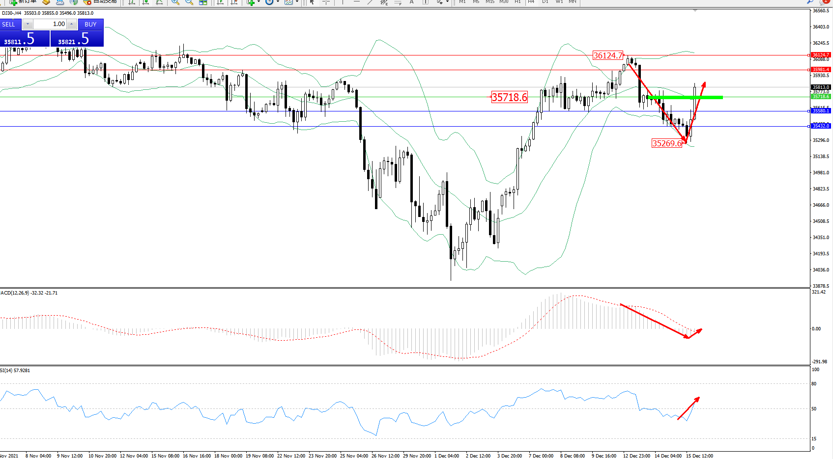 道琼斯指数12月15日(周三)收盘上涨382.59点,涨幅1.08%,报35926.77点;美股收盘,道指初步收涨,美联储公布最新的12月利率决议,美联储维持利率0-0.25%不变,符合市场预期。美联储加速缩债,将每月资产购买规模减少300亿美元,此前为每月减少150亿美元。美联储点阵图显示,预计2022年美联储将加息三次,2023年加息三次。